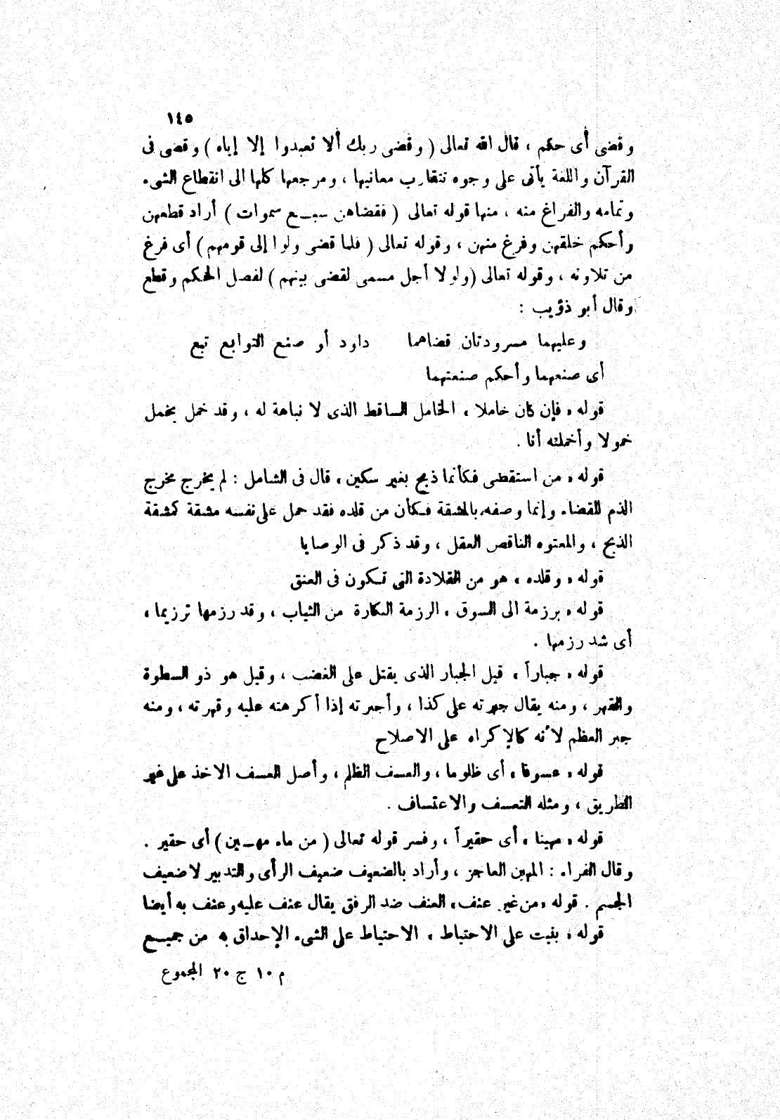 وقضى أي حكم، قال الله تعالى (وقضى ربك ألا تعبدوا إلا إياه) وقضى في القرآن واللغة يأتي على وجوه تتقارب معانيها، ومرجعها كلها إلى انقطاع الشئ وتمامه والفراغ منه، منها قوله تعالى (فقضاهن سبع سموات) أراد قطعهن وأحكم خلقهن وفرغ منهن، وقوله تعالى (فلما قضى ولوا إلى قومهم) أي فرغ من تلاوته، وقوله تعالى (ولولا أجل مسمى لقضى بينهم) لفصل الحكم وقطع وقال أبو ذؤيب: وعليهما مسرودتان قضاهما