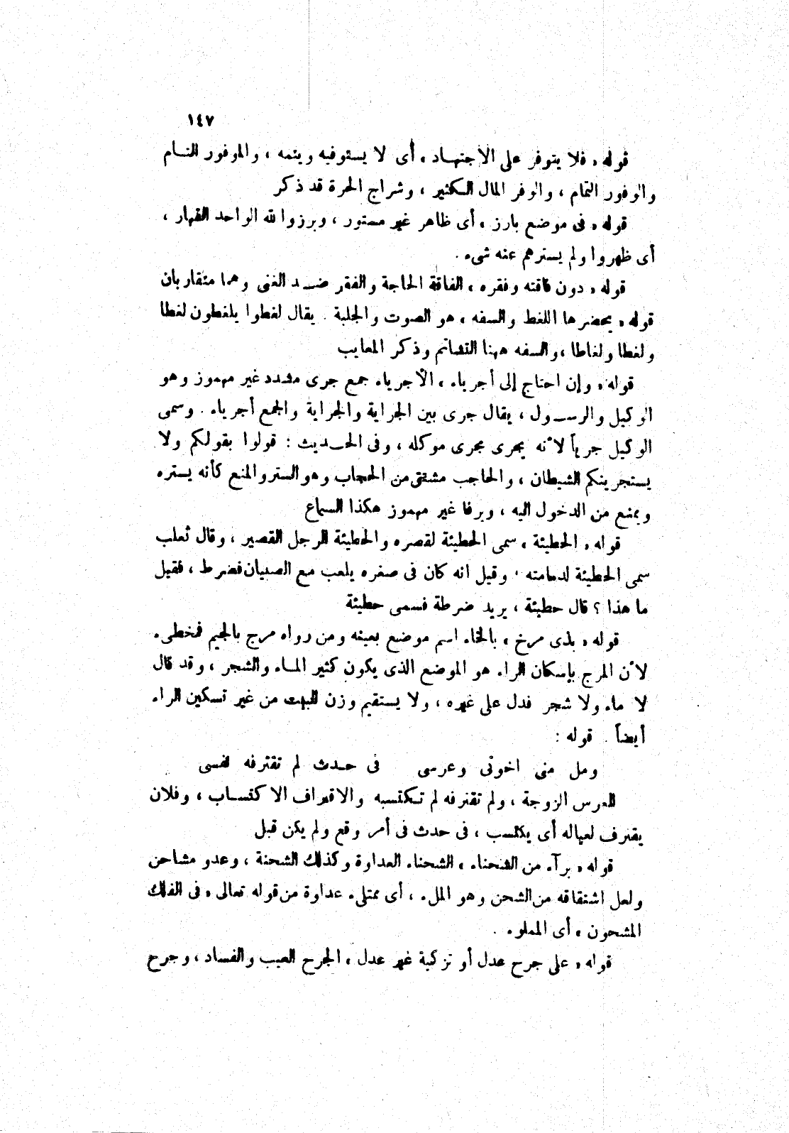 العرس الزوجة، ولم تقترفه لم تكتبسه والاقتراف الاكتساب، وفلان يقترف لعياله أي يكتسب، في حدث في أمر وقع ولم يكن قبل قوله (برآه من الشحناء) الشحناء العداوة وكذلك الشحنة، وعدو مشاحن ولعل اشتقاقه من الشحن وهو الملء، أي ممتلئ عداوة من قوله تعالى (في الفلك المشحون) أي المملوء.