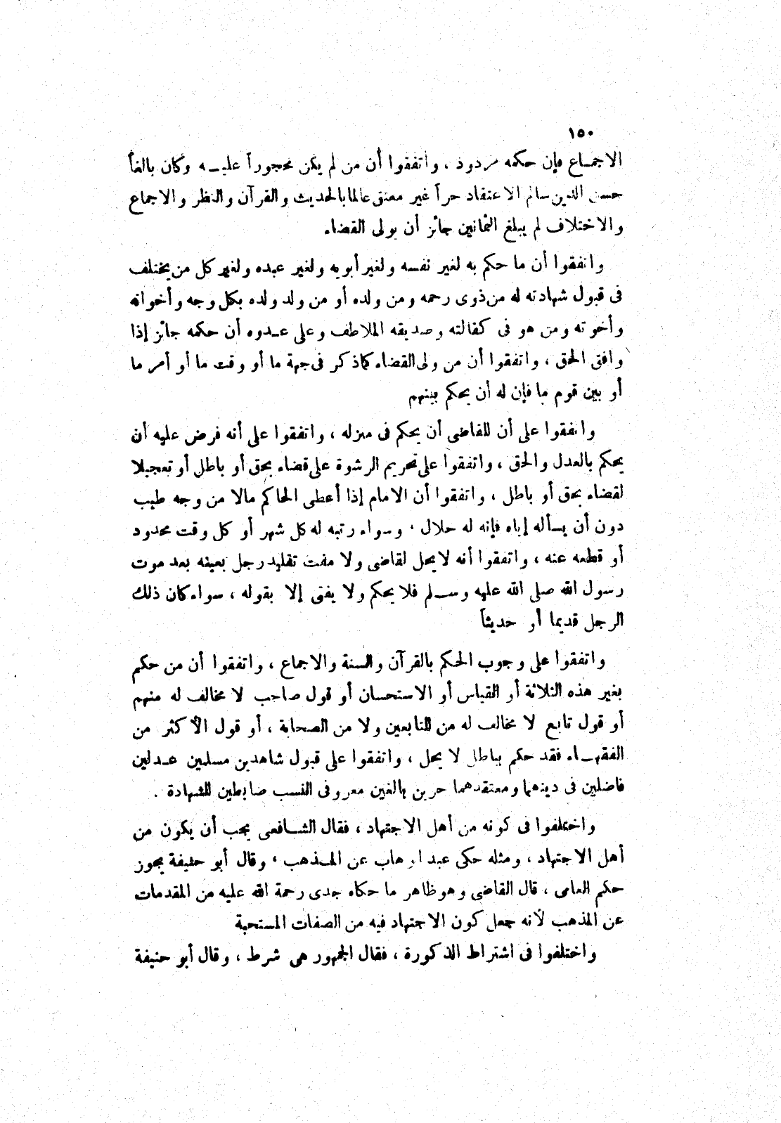 واتفقوا على وجوب الحكم بالقرآن والسنة والاجماع، واتفقوا أن من حكم بغيره هذه الثلاثة أو القياس أو الاستحسان أو قول صاحب لا مخالف له منهم أو قول تابع لا مخالف له من التابعين ولا من الصحابة، أو قول الاكثر من الفقهاء فقد حكم بباطل لا يحل، واتفقوا على قبول شاهدين مسلمين عدلين فاضلين في دينهما ومعتقدهما حرين بالغين معروفى النسب ضابطين للشهادة.