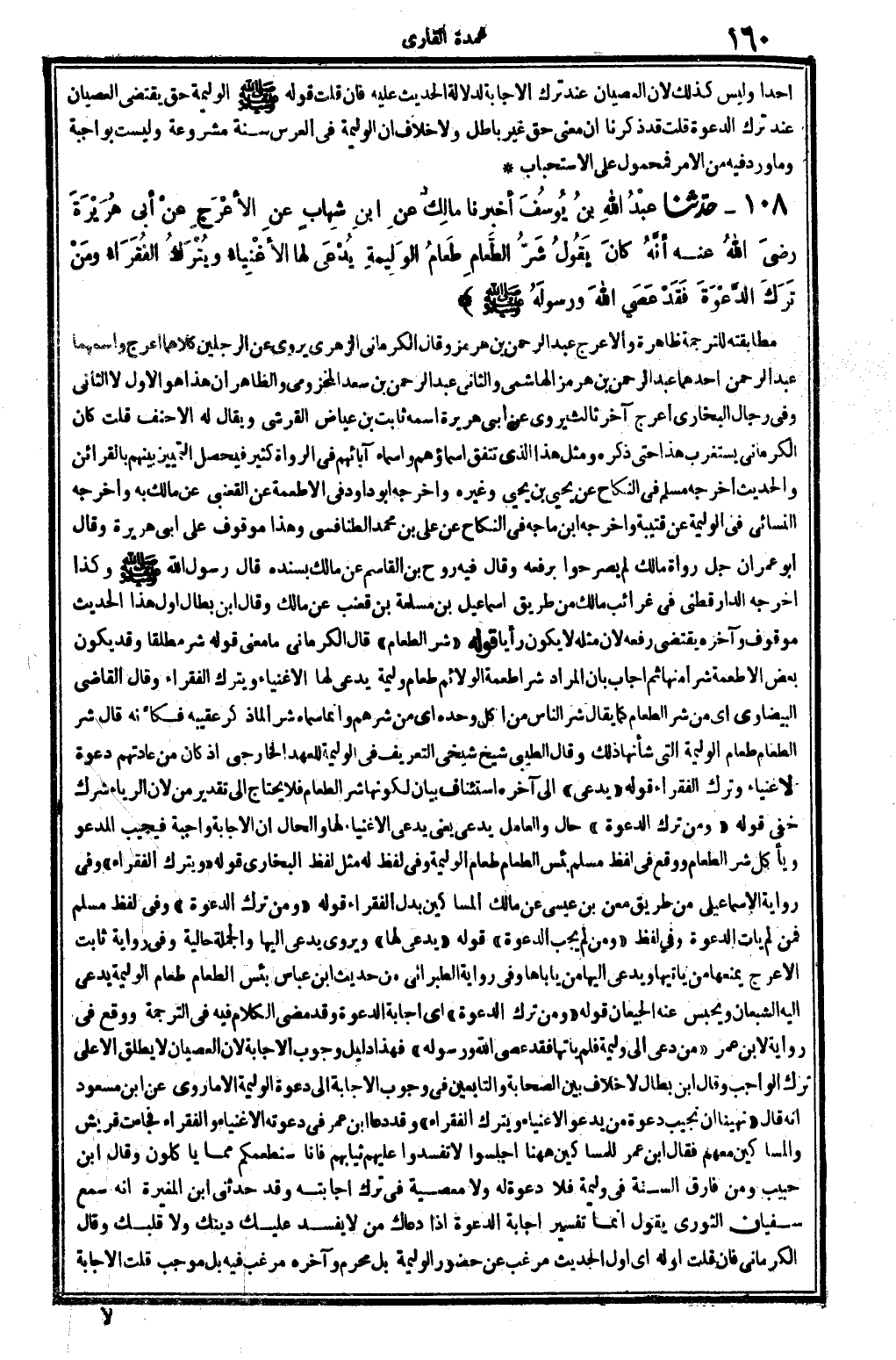قَوْله: (شَرّ الطَّعَام) ، قَالَ الْكرْمَانِي: مَا معنى قَوْله: شَرّ مُطلقًا، وَقد يكون بعض الْأَطْعِمَة شرا مِنْهَا، ثمَّ أجَاب بِأَن المُرَاد شَرّ أَطْعِمَة الولائم طَعَام وَلِيمَة يدعى لَهَا الْأَغْنِيَاء وَيتْرك الْفُقَرَاء، وَقَالَ القَاضِي الْبَيْضَاوِيّ: أَي من شَرّ الطَّعَام، كَمَا يُقَال: شَرّ النَّاس من أكل وَحده، أَي: من شرهم، وَإِنَّمَا سَمَّاهُ شرا لما ذكر عَقِيبه فَكَأَنَّهُ قَالَ: شَرّ الطَّعَام طَعَام الْوَلِيمَة الت شَأْنهَا ذَلِك، وَقَالَ الطَّيِّبِيّ: شيخ شَيْخي التَّعْرِيف فِي الْوَلِيمَة للْعهد الْخَارِجِي إِذْ كَانَ من عَادَتهم دَعْوَة الْأَغْنِيَاء وَترك الْفُقَرَاء. قَوْله: (يَدعِي) إِلَى آخِره اسْتِئْنَاف بَيَان لكَونهَا شَرّ الطَّعَام فَلَا يحْتَاج إِلَى تَقْدِير: من لِأَن الرِّيَاء شرك خَفِي. قَوْله: (وَمن ترك الدعْوَة) ، حَال وَالْعَامِل يدعى يَعْنِي: يدعى الْأَغْنِيَاء. لَهَا وَالْحَال أَن الْإِجَابَة وَاجِبَة فيجيب الْمَدْعُو وَيَأْكُل شَرّ الطَّعَام، وَوَقع فِي لفظ مُسلم: بئس الطَّعَام طَعَام الْوَلِيمَة، وَفِي لفظ لَهُ مثل لفظ البُخَارِيّ. قَوْله: (وَيتْرك الْفُقَرَاء) ، وَفِي رِوَايَة الْإِسْمَاعِيلِيّ من طَرِيق معن بن عِيسَى بن مَالك: الْمَسَاكِين، بدل: الْفُقَرَاء. قَوْله: (وَمن ترك الدعْوَة) ، وَفِي لفظ مُسلم: فَمن لم يَأْتِ الدعْوَة، وَفِي لفظ: (وَمن لم يجب الدعْوَة) . قَوْله: (يَدعِي لَهَا) ، ويروي: يَدعِي إِلَيْهَا، وَالْجُمْلَة حَالية، وَفِي رِوَايَة ثَابت الْأَعْرَج: يمْنَعهَا من يَأْتِيهَا وَيَدعِي إِلَيْهَا من يأباها، وَفِي رِوَايَة الطَّبَرَانِيّ من حَدِيث ابْن عَبَّاس: بئس الطَّعَام طَعَام الْوَلِيمَة يَدعِي إِلَيْهِ الشبعان وَيحبس عَنهُ الجيعان. قَوْله: (وَمن ترك الدعْوَة) أَي: إِجَابَة الدعْوَة، وَقد مضى الْكَلَام فِيهِ فِي التَّرْجَمَة، وَوَقع فِي رِوَايَة لِابْنِ عمر: (من دعى إِلَى وَلِيمَة فَلم يأتها فقد عصى الله وَرَسُوله) . فَهَذَا دَلِيل وجوب الْإِجَابَة لِأَن الْعِصْيَان لَا يُطلق إلاَّ على ترك الْوَاجِب، وَقَالَ ابْن بطال: لَا خلاف بَين الصَّحَابَة وَالتَّابِعِينَ فِي وجوب الْإِجَابَة إِلَى دَعْوَة الْوَلِيمَة إلاَّ مَا رُوِيَ عَن ابْن مَسْعُود أَنه قَالَ: (نهينَا أَن نجيب دَعْوَة من يَدْعُو الْأَغْنِيَاء وَيتْرك الْفُقَرَاء) . وَقد دَعَا ابْن عمر فِي دَعوته الْأَغْنِيَاء والفقراء، فَجَاءَت قُرَيْش وَالْمَسَاكِين مَعَهم، فَقَالَ ابْن عمر للْمَسَاكِين: هَهُنَا اجلسوا لَا تفسدوا عَلَيْهِم ثِيَابهمْ فَإنَّا سنطعمكم مِمَّا يَأْكُلُون. وَقَالَ ابْن حبيب: وَمن فَارق السّنة فِي وَلِيمَة فَلَا دَعْوَة لَهُ وَلَا مَعْصِيّة فِي ترك إجَابَته، وَقد حَدثنِي ابْن الْمُغيرَة أَنه سمع سُفْيَان الثَّوْريّ يَقُول: إِنَّمَا تَفْسِير إِجَابَة الدعْوَة إِذا دعَاك من لَا يفْسد عَلَيْك دينك وَلَا قَلْبك، وَقَالَ الْكرْمَانِي: فَإِن قلت: أَوله أَي: أول الحَدِيث مرغب عَن حُضُور الْوَلِيمَة بل محرم وَآخره مرغب فِيهِ، بل مُوجب. قلت: الْإِجَابَة