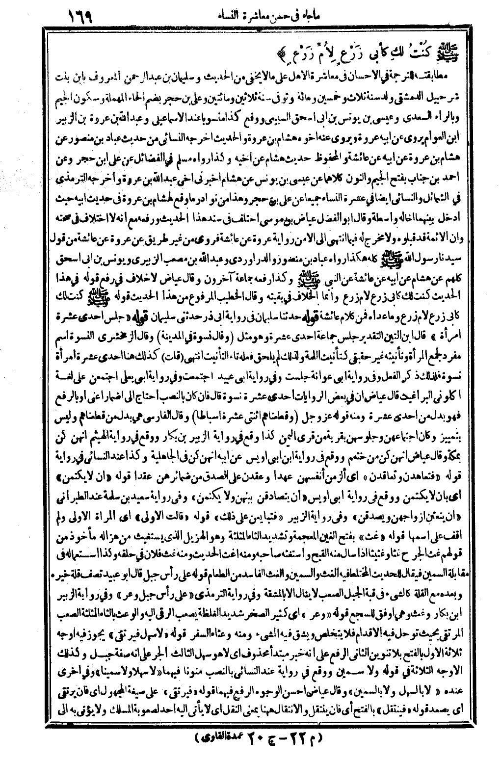 والْحَدِيث أخرجه النَّسَائِيّ من حَدِيث عباد بن مَنْصُور عَن هِشَام بن عُرْوَة عَن أَبِيه عَن عَائِشَة، وَالْمَحْفُوظ حَدِيث هِشَام عَن أَخِيه، وَكَذَا رَوَاهُ مُسلم فِي الْفَضَائِل عَن عَليّ بن حجر وَعَن أَحْمد بن جناب، بِفَتْح الْجِيم وَالنُّون: كِلَاهُمَا عَن عِيسَى بن يُونُس عَن هِشَام: أَخْبرنِي أخي عبد الله بن عُرْوَة. وأخره التِّرْمِذِيّ فِي الشَّمَائِل، وَالنَّسَائِيّ أَيْضا فِي عشرَة النِّسَاء جَمِيعًا عَن عَليّ بن حجر، وَهَذَا من نَوَادِر مَا وَقع لهشام بن عُرْوَة فِي حَدِيث أَبِيه حَيْثُ أَدخل بَينهمَا أَخا لَهُ وَاسِطَة. وَقَالَ أَبُو الْفضل عِيَاض بن مُوسَى: اخْتلف فِي سَنَد هَذَا الحَدِيث وَرَفعه مَعَ أَنه لَا اخْتِلَاف فِي صِحَّته وَأَن الْأَئِمَّة قبلوه وَلَا مخرج لَهُ فِيمَا انْتهى إِلَيّ إلاَّ من رِوَايَة عُرْوَة عَن عَائِشَة، فَروِيَ من غير طَرِيق: عَن عُرْوَة عَن عَائِشَة من قَول سيدنَا رَسُول الله صلى الله عَلَيْهِ وَسلم كُله، هَكَذَا رَوَاهُ عباد بن مَنْصُور والدراوردي وَعبد الله بن مُصعب الزبيرِي وَيُونُس بن أبي إِسْحَاق كلهم عَن هِشَام عَن أَبِيه عَن عَائِشَة عَن النَّبِي صلى الله عَلَيْهِ وَسلم، وَكَذَا رَفعه جمَاعَة آخَرُونَ، وَقَالَ عِيَاض: لَا خلاف فِي رفع قَوْله. فِي هَذَا الحَدِيث: (كنت ل كَأَنِّي زرع لأم زرع) وَإِنَّمَا الْخلاف فِي بَقِيَّته. وَقَالَ الْخَطِيب: الْمَرْفُوع من هَذَا الحَدِيث قَوْله صلى الله عَلَيْهِ وَسلم: (كنت لم كَأبي زرع لأم زرع) وَمَا عداهُ، فَمن كَلَام عَائِشَة.