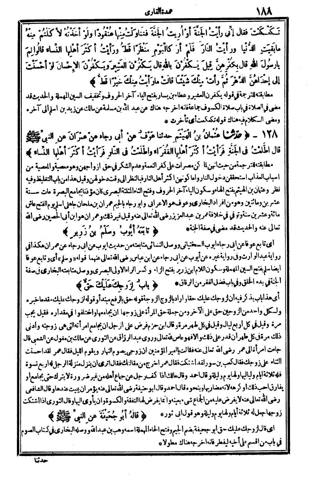 وَعُثْمَان بن الْهَيْثَم، بِفَتْح الْهَاء وَسُكُون الْيَاء آخر الْحُرُوف وَفتح الثَّاء الْمُثَلَّثَة الْبَصْرِيّ كَانَ مُؤذنًا بِجَامِع الْبَصْرَة، مَاتَ سنة عشْرين وَمِائَتَيْنِ وَهُوَ من أَفْرَاد البُخَارِيّ، وعَوْف هُوَ الْأَعرَابِي وَأَبُو رَجَاء بِالْجِيم عمرَان بن ملْحَان جاهلي أسلم يَوْم الْفَتْح عَاشَ مائَة وَعشْرين سنة وَتُوفِّي فِي خلَافَة عمر بن عبد الْعَزِيز رَضِي الله تَعَالَى عَنهُ. وَقيل: غير ذَلِك، وَعمْرَان هُوَ ابْن أبي الْحصين، رَضِي الله تَعَالَى عَنهُ. والْحَدِيث قد مضى فِي صفة الْجنَّة.