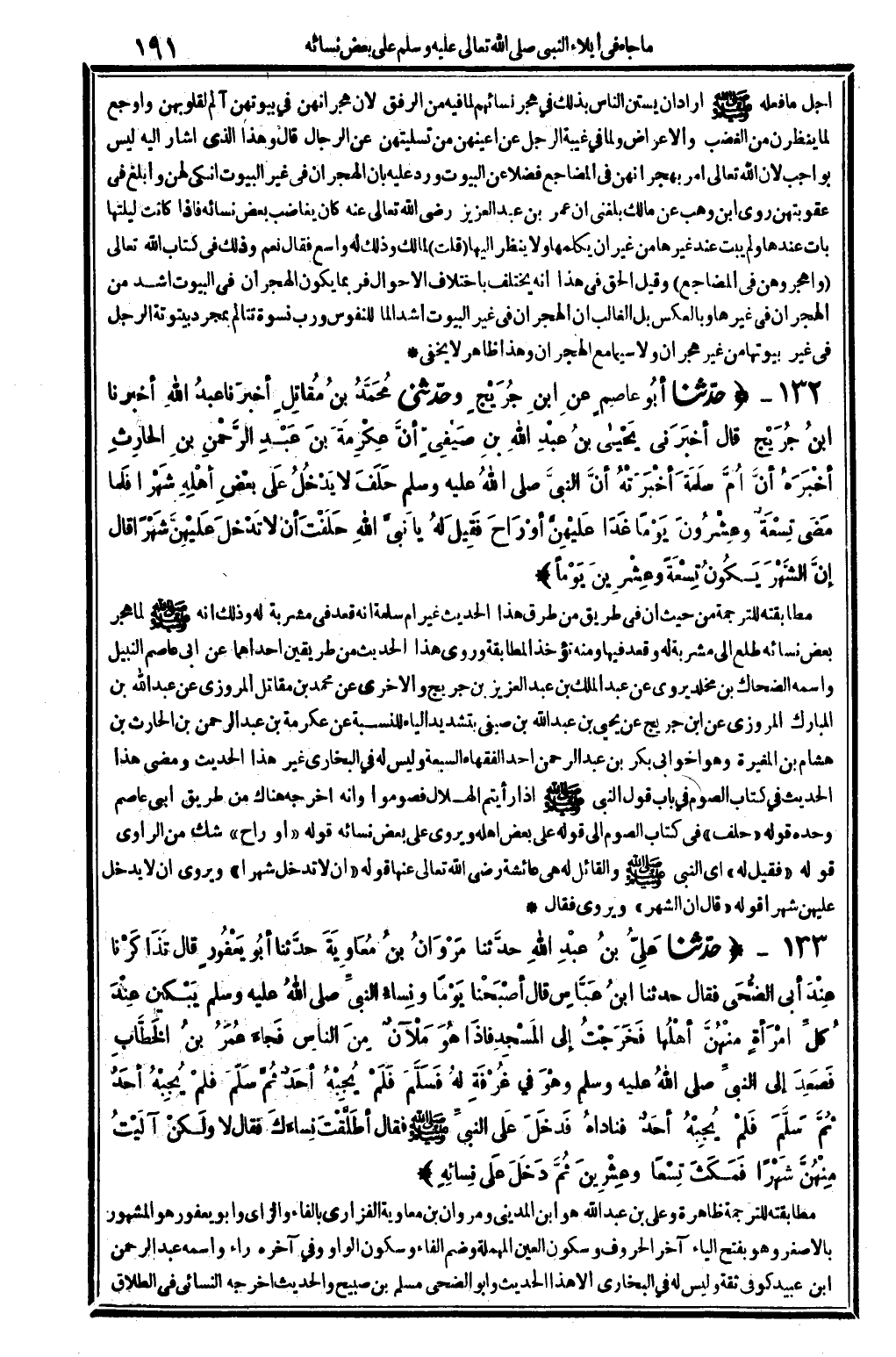 3025 - حدّثنا عَلِيُّ بنُ عبْدِ الله حدَّثنا مَرْوَانُ بنُ مُعَاوِيَةَ حدَّثنا أَبُو يَعْفُورٍ قَالَ تَذَاكَرْنا عِنْدَ أبِي الضُّحَى، فَقَالَ: حَدثنَا ابنُ عَبَّاس، قَالَ: أصْبَحْنا يَوْما ونِساءُ النبيِّ صلى الله عَلَيْهِ وَسلم، يَبْكين عِنْدَ كُلِّ امْرأةٍ مِنْهُنَّ، فَخَرَجْتُ إِلَى المَسْجِدِ، فإذَا هُوَ مَلْآنٌ مِنَ النَّاس، فَجاءَ عُمَرَ بنُ الخَطَّابِ فَصَعِدَ إِلَى النَّبِي صلى الله عَلَيْهِ وَسلم، وَهْوَ فِي غُرْفَةٍ لهُ، فَسَلَّمَ فَلَمْ يُجِبْهُ أحَدٌ ثُمَّ سَلّمَ فلمْ يُجِبْهُ أحَدٌ، ثُمَّ سَلَّمَ فلَمْ يُجِبْهُ أحَدٌ، فناداهُ فَدخَلَ عَلى النبيِّ صلى الله عَلَيْهِ وَسلم فَقَالَ: أطَلَّقْتَ نِساءَكَ؟ فَقَالَ: لَا ولَكنْ آلَيْتُ مِنْهُنَّ شَهْرا، فَمَكَثَ تِسْعا وعِشْرِينَ ثُمَّ دَخَلَ عَلى نِسائِهِ.