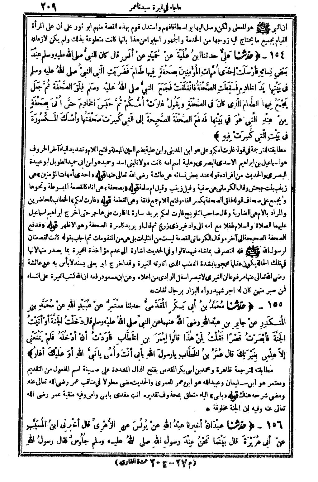 6225 - حدّثنا مُحَمَّدُ بنُ أبي بَكْرٍ المُقَدَّميُّ حَدثنَا معْتَمِرٌ عنْ عُبَيْدِ الله عنْ مُحَمَّدِ بنِ المُنكَدِرِ عنْ جابِرِ بنِ عبْد الله عَنْهُمَا، عَن النبيِّ صلى الله عَلَيْهِ وَسلم، قَالَ: دَخَلْتُ الجَنَّة أَو: أتَيْتُ الجَنةَ فأبْصَرْتُ قَصْرا. فَقُلْتُ: لِمَنْ هاذَا؟ قالُوا: لِعُمَرَ بنِ الخَطَّاب، فأرَدْتُ أَن أدْخُلَهُ فلَمْ يَمْنَعَنِي إلاّ عِلْمِي بِغَيْرَتِكَ قَالَ عُمَرُ بنُ الخَطَّابِ: يَا رسولَ الله! بِأبي أنْتَ وأُمِّي يَا نَبِيَّ الله أوَ علَيْكَ أغَارُ.