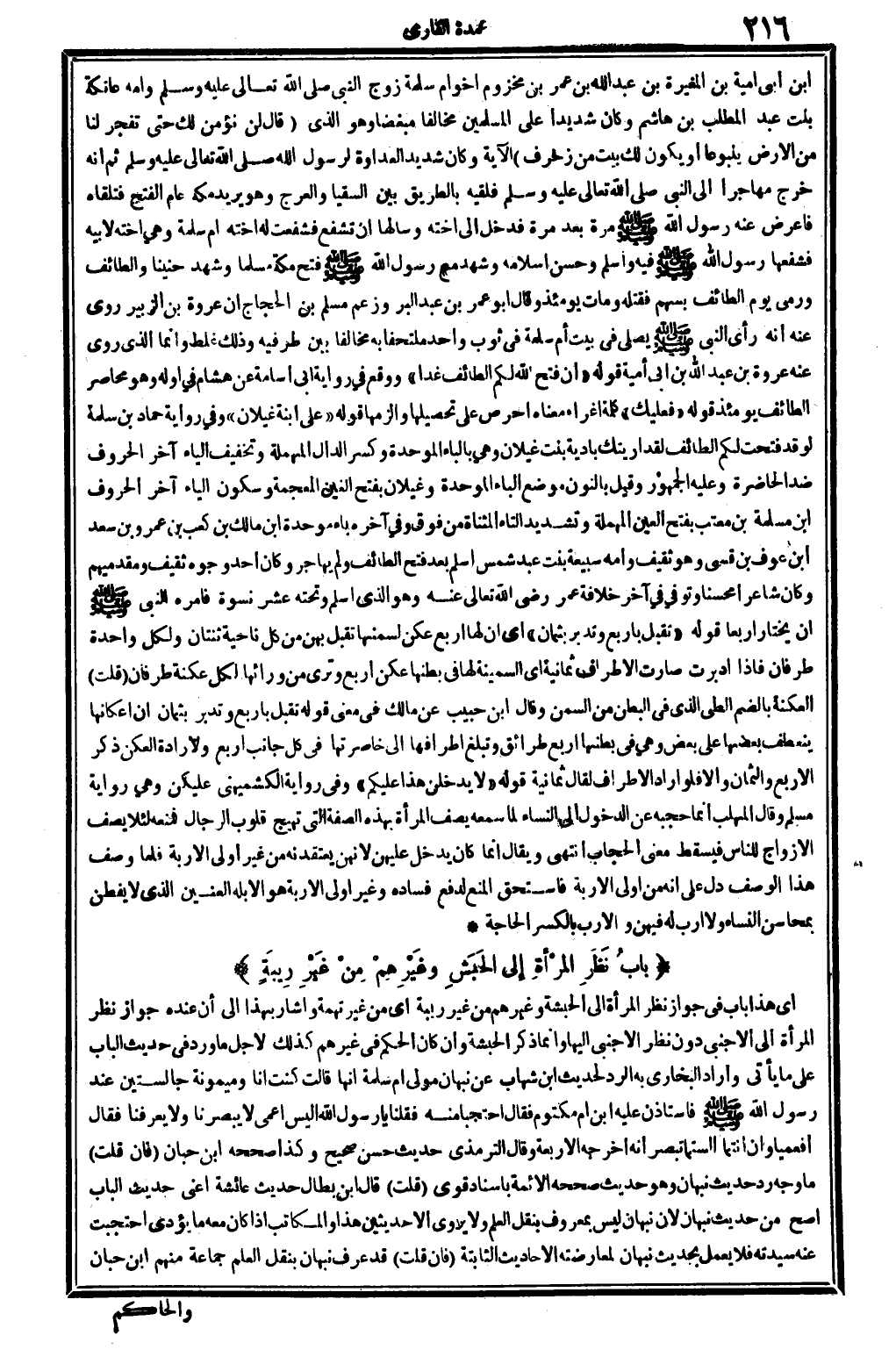 أبي أُميَّة بن الْمُغيرَة بن عبد الله بن عمر بن مَخْزُوم أَخُو أم سَلمَة زوج النَّبِي صلى الله عَلَيْهِ وَسلم، وَأمه عَاتِكَة بنت عبد الْمطلب بن هَاشم، وَكَانَ شَدِيدا على الْمُسلمين مُخَالفا مبغضا وَهُوَ الَّذِي {قَالَ لن نؤمن لَك حَتَّى تفجر لنا من الأَرْض ينبوعا} (الْإِسْرَاء: 09) {وَيكون ذَلِك بَيت من زخرف} (الْإِسْرَاء: 39) الْآيَة، وَكَانَ شَدِيد الْعَدَاوَة لرَسُول الله صلى الله عَلَيْهِ وَسلم، ثمَّ أَنه خرج مُهَاجرا إِلَى النَّبِي صلى الله عَلَيْهِ وَسلم، فَلَقِيَهُ بِالطَّرِيقِ بَين السقيا وَالْعَرج وَهُوَ يُرِيد مَكَّة عَام الْفَتْح، فَتَلقاهُ فَأَعْرض عَنهُ رَسُول الله صلى الله عَلَيْهِ وَسلم مرّة بعد مرّة، فَدخل إِلَى أُخْته وسألها أَن تشفع فشفعت لَهُ أُخْته أم سَلمَة وَهِي أُخْته لِأَبِيهِ فشفعها رَسُول الله صلى الله عَلَيْهِ وَسلم فِيهِ. وَأسلم وَحسن إِسْلَامه وَشهد مَعَ رَسُول الله صلى الله عَلَيْهِ وَسلم فتح مَكَّة مُسلما، وَشهد حنينا والطائف وَرمي يَوْم الطَّائِف بِسَهْم فَقتله وَمَات يَوْمئِذٍ، وَقَالَ أَبُو عمر بن عبد الْبر: وَزعم مُسلم بن الْحجَّاج أَن عُرْوَة بن الزبير روى عَنهُ أَنه: رأى النَّبِي صلى الله عَلَيْهِ وَسلم فِي بَيت أم سَلمَة فِي ثوب وَاحِد ملتحفا بِهِ مُخَالفا بَين طَرفَيْهِ، وَذَلِكَ غلط، وَإِنَّمَا الَّذِي روى عَنهُ عُرْوَة بن عبد الله بن أبي أُميَّة. قَوْله: (إِن فتح الله لكم الطَّائِف غَدا) . وَوَقع فِي رِوَايَة أبي أُسَامَة عَن هِشَام فِي أَوله وَهُوَ محاصر الطَّائِف يَوْمئِذٍ. قَوْله: (فَعَلَيْك) كلمة إغراء مَعْنَاهُ احرص على تَحْصِيلهَا والزمها. قَوْله: (على ابْنة غيلَان) ، وَفِي رِوَايَة حَمَّاد بن سَلمَة: لَو قد فتحت لكم الطَّائِف لقد أريتك بادية بنت غيلَان، وَهِي بِالْبَاء الْمُوَحدَة وَكسر الدَّال الْمُهْملَة وَتَخْفِيف الْيَاء آخر الْحُرُوف ضد الْحَاضِرَة وَعَلِيهِ الْجُمْهُور. وَقيل بالنُّون مَوضِع الْبَاء الْمُوَحدَة، وغيلان بِفَتْح الْغَيْن الْمُعْجَمَة وَسُكُون الْيَاء آخر الْحُرُوف: ابْن مسلمة بن معتب، بِفَتْح الْعين الْمُهْملَة وَتَشْديد التَّاء الْمُثَنَّاة من فَوق وَفِي آخِره بَاء مُوَحدَة ابْن مَالك بن كَعْب بن عَمْرو بن سعد بن عَوْف بن قسي وَهُوَ ثَقِيف وَأمه سبيعة بنت عبد شمس، أسلم بعد فتح الطَّائِف، وَلم يُهَاجر وَكَانَ أحد وُجُوه ثَقِيف ومقدميهم وَكَانَ شَاعِرًا محسنا، وَتُوفِّي فِي آخر خلَافَة عمر، رَضِي الله تَعَالَى عَنهُ، وَهُوَ الَّذِي أسلم وَتَحْته عشر نسْوَة، فَأمر النَّبِي صلى الله عَلَيْهِ وَسلم أَن يخْتَار أَرْبَعَة. قَوْله: (تقبل بأَرْبعَة وتدبر بثمان) أَي أَن لَهَا أَربع عُكَن لسمنها تقبل بِهن من كل نَاحيَة ثِنْتَانِ وَلكُل وَاحِدَة طرفان، فَإِذا أَدْبَرت صَارَت الأطرف ثَمَانِيَة أَي السمينة لَهَا فِي بَطنهَا عُكَن أَربع وَترى من وَرَائِهَا لكل عكنة طرفان قلت: العكنة بِالضَّمِّ الطي الَّذِي فِي الْبَطن من السّمن، وَقَالَ ابْن حبيب: عَن مَالك فِي معنى قَوْله: (تقبل بِأَرْبَع وتدبر بثمان) أَن أعكانها يَنْعَطِف بَعْضهَا على بعض وَهِي فِي بَطنهَا أَربع طرائق وتبلغ أطرافها إِلَى حاضرتها فِي كل جَانب أَربع ولإرادة العكن ذكر الْأَرْبَع والثمان وَإِلَّا فَلَو أَرَادَ الْأَطْرَاف لقَالَ: ثَمَانِيَة. قَوْله: (لَا يدخلن هَذَا عَلَيْكُم) ، وَفِي رِوَايَة الْكشميهني: عليكن، وَهِي رِوَايَة مُسلم. وَقَالَ الْمُهلب: إِنَّمَا حجبه عَن الدُّخُول إِلَى النِّسَاء لما سَمعه يصف الْمَرْأَة بِهَذِهِ الصّفة الَّتِي تهيج قُلُوب الرِّجَال، فَمَنعه لِئَلَّا يصف الْأزْوَاج للنَّاس فَيسْقط معنى الْحجاب. انْتهى. وَيُقَال: إِنَّمَا كَانَ يدْخل عَلَيْهِنَّ لِأَنَّهُنَّ يعتقدنه من غير أولي الإربة، فَلَمَّا وصف هَذَا الْوَصْف دلّ على أَنه من أولى الإربة، فَاسْتحقَّ الْمَنْع 