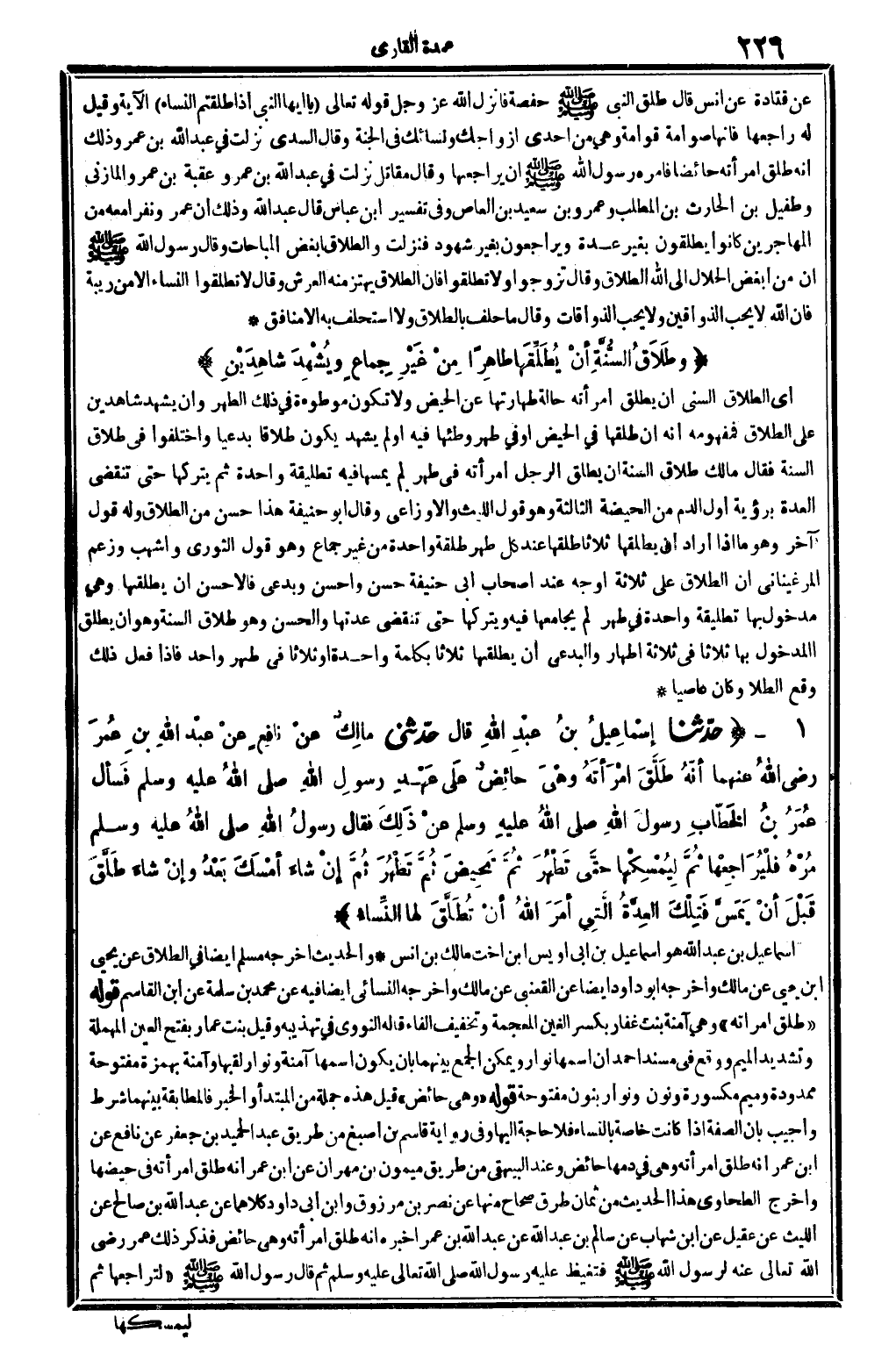 1525 - حدّثنا إسْماعِيلُ بنُ عبْدِ الله قَالَ: حدّثني مالِكٌ عنْ نافِعٍ عنْ عبدِ الله بنِ عُمَر رَضِي الله عَنْهُمَا، أنَّهُ طَلَّقَ امْرَأتَهُ وهْيَ حائِضٌ علَى عَهْدِ رسولِ الله صلى الله عَلَيْهِ وَسلم، فَسَأَلَ عُمَرُ بنُ الخَطَّابِ رسولَ الله صلى الله عَلَيْهِ وَسلم، عنْ ذَلك؟ فَقَالَ رسولُ الله صلى الله عَلَيْهِ وَسلم: مُرْهُ فلْيُرَاجِعْها ثُمَّ لِيُمْسِكْها حتَّى تَطْهَرُ ثُمَّ تَحِيضَ ثُمَّ تَطْهَرُ ثُمَّ إنْ شاءَ أمْسَكَ بَعْدُ، وإنْ شاءَ طَلَّقَ قَبْلَ أنْ يَمَسَّ فَتِلْكَ العِدَّةُ الَّتي أمَرَ الله أَن تُطَلَّقَ لَهَا النِّساء.