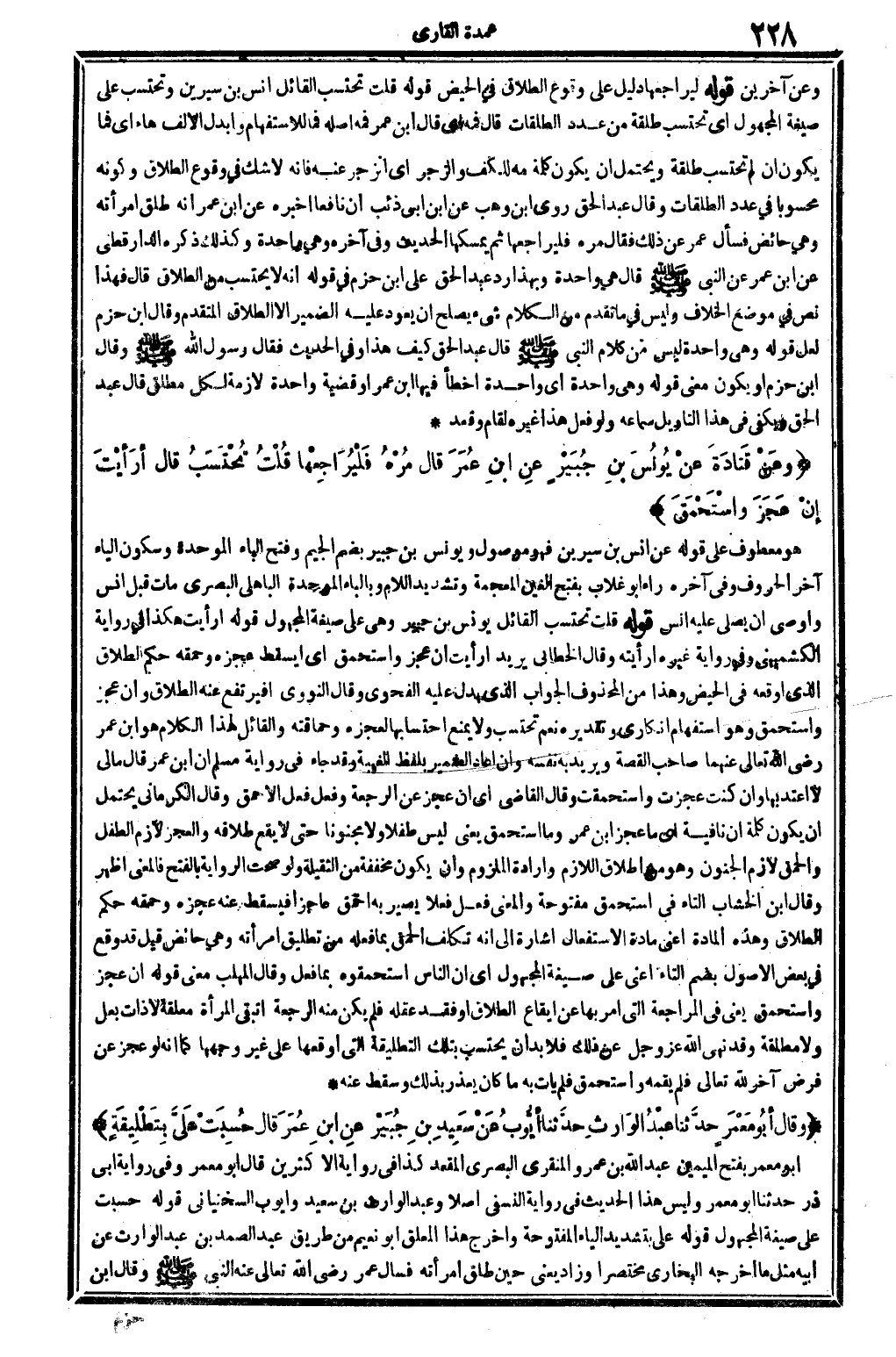 وعَنْ قَتَادَةَ عنْ يُونُسَ بنِ جُبَيْرٍ عنِ ابنِ عُمَرَ، قَالَ: مُرْهُ فَلْيُرَاجِعْها قُلْتُ: تُحْتَسَبُ؟ قَالَ: أرَأيْتَ إنْ عَجَزَ واسْتَحْمَقَ؟ .
