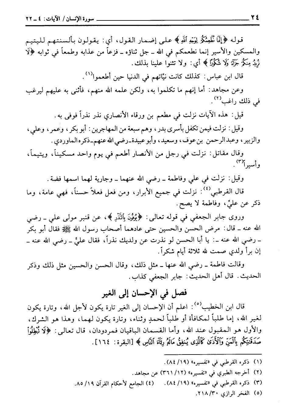 قال ابن الخطيب: اعلم أن الإحسان إلى الغير تارة يكون لأجل الله، وتارة يكون لغير الله، إما طلباً لمكافأة أو طلباً لحمدٍ وثناء، وتارة يكون لهما، وهذا هو الشرك، والأول هو المقبول عند الله، وأما القسمان الباقيان فمردودان، قال تعالى: {لاَ تُبْطِلُواْ صَدَقَاتِكُم بالمن والأذى كالذي يُنْفِقُ مَالَهُ رِئَآءَ الناس} [البقرة: 264] .