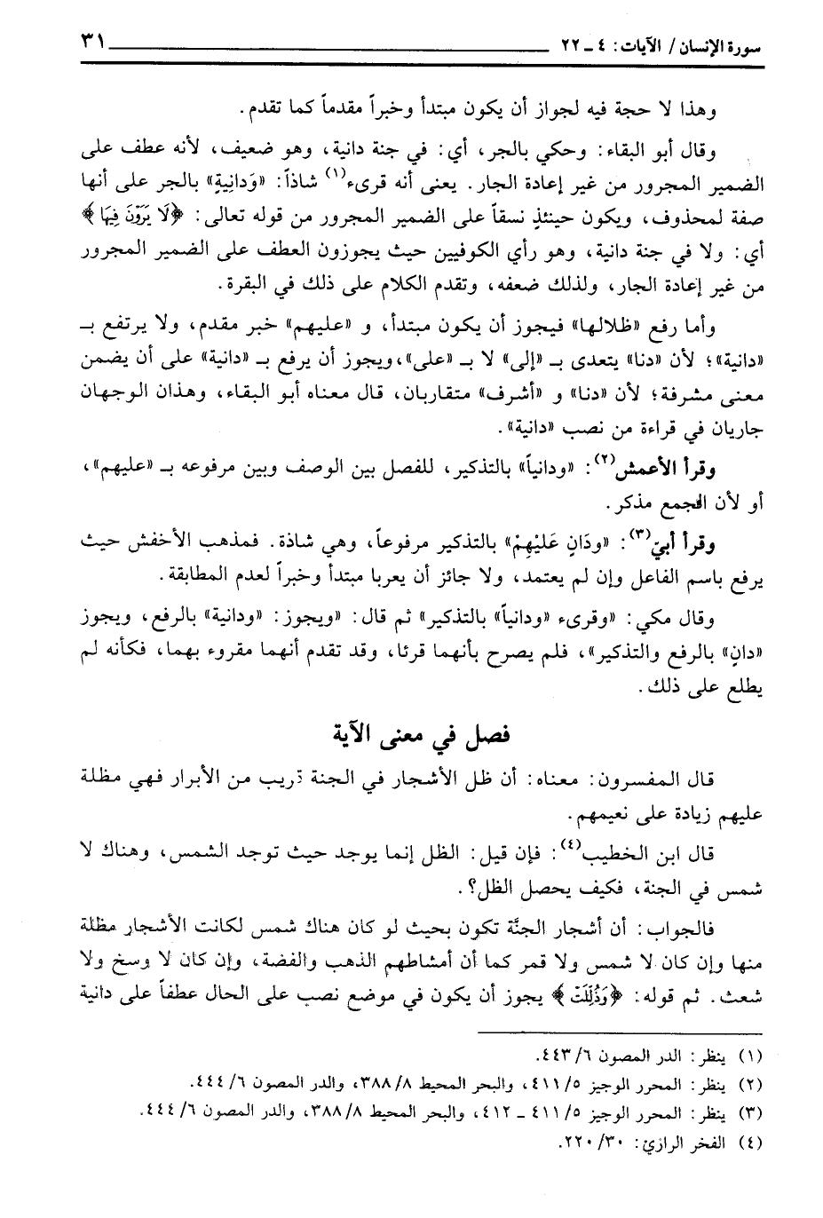 وقال مكي: «وقرئ» ودانياً «بالتذكير» ثم قال: «ويجوز:» ودانية «بالرفع، ويجوز» دانٍ «بالرفع والتذكير» ، فلم يصرح بأنهما قرئا، وقد تقدم أنهما مقروء بهما، فكأنه لم يطلع على ذلك.