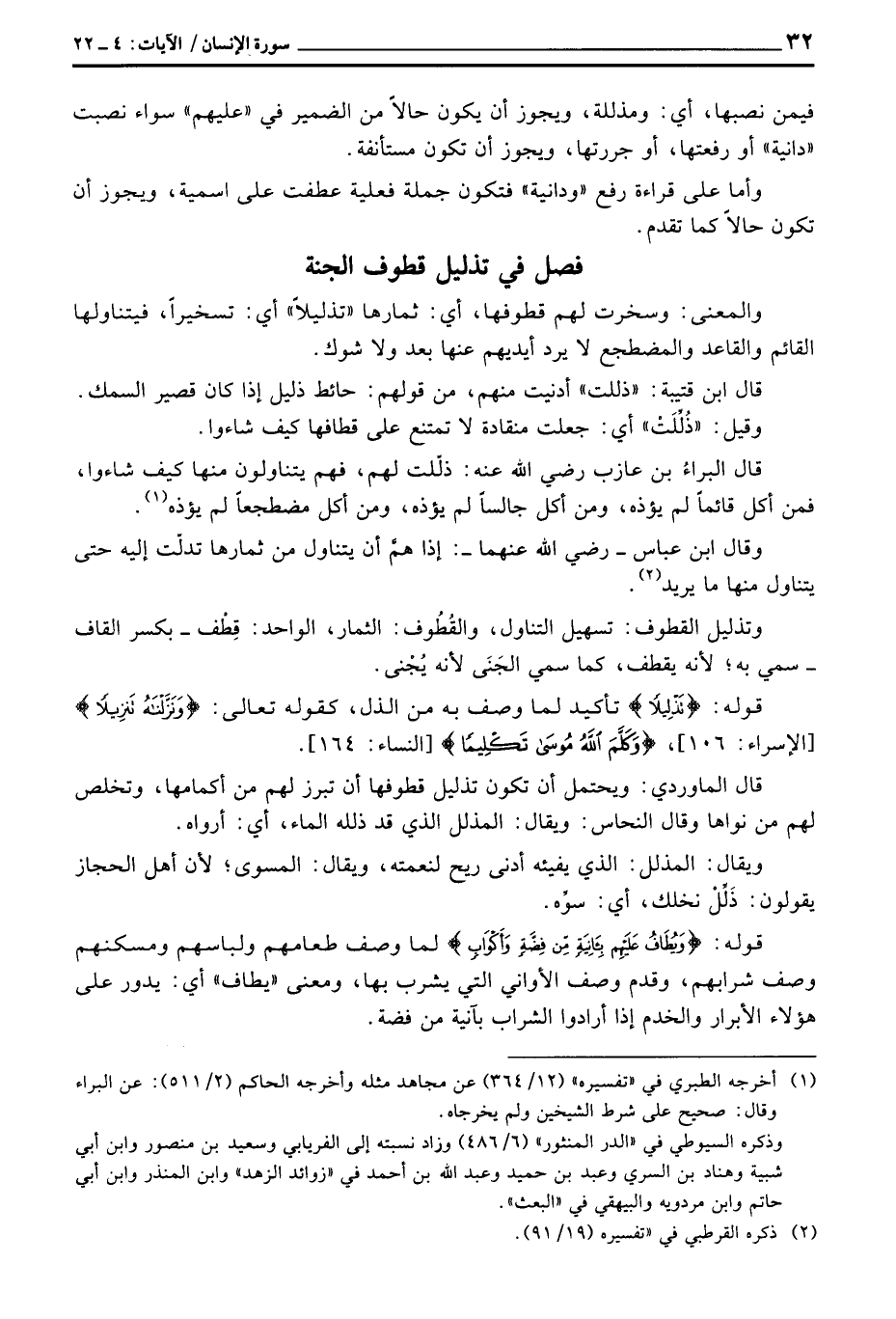 قال الماوردي: ويحتمل أن تكون تذليل قطوفها أن تبرز لهم من أكمامها، وتخلص لهم من نواها وقال النحاس: ويقال: المذلل الذي قد ذلله الماء، أي: أرواه.