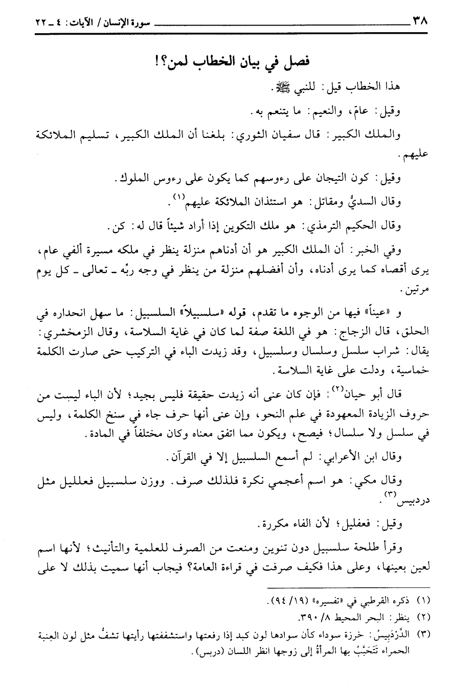 وقرأ طلحة سلسبيل دون تنوين ومنعت من الصرف للعلمية والتأنيث؛ لأنها اسم لعين بعينها، وعلى هذا فكيف صرف في قراءة العامة؟ فيجاب أنها سميت بذلك لا على