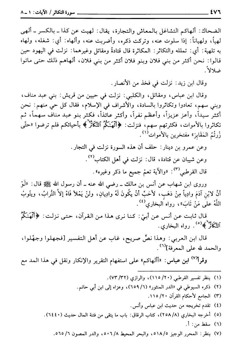 وقال ابن عباسٍ: ومقاتل، والكلبي: نزلت في حيين من قريش: بني عبد مناف، وبني سهم، تعادوا وتكاثروا بالسادة، والأشراف في الإسلام، فقال كل حي منهم: نحن أكثر سيداً، وأعز عزيزاً، وأعظم نفراً، وأكثر عائذاً، فكثر بنو عبد مناف سهماً، ثم تكاثروا بالأموات، فكثرتهم سهم، فنزلت: {أَلْهَاكُمُ التكاثر} بأحيائكم فلم ترضوا {حتَّى زُرْتُمُ المَقَابِرَ} مفتخرين بالأموات.