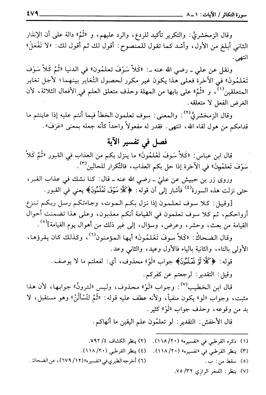 ونقل عن علي - رَضِيَ اللَّهُ عَنْه -: {كَلاَّ سَوْفَ تعلمُون} في الدنيا {ثُمَّ كَلاَّ سَوْفَ تَعْلمُونَ} في الآخرة فعلى هذا يكون غير مكرر لحصول التَّغاير بينهما؛ لأجل تغاير المتعلقين، و «ثُمَّ» على بابها من المهلة وحذف متعلق العلم في الأفعال الثلاثة، لأن الغرض الفعل لا متعلقه.