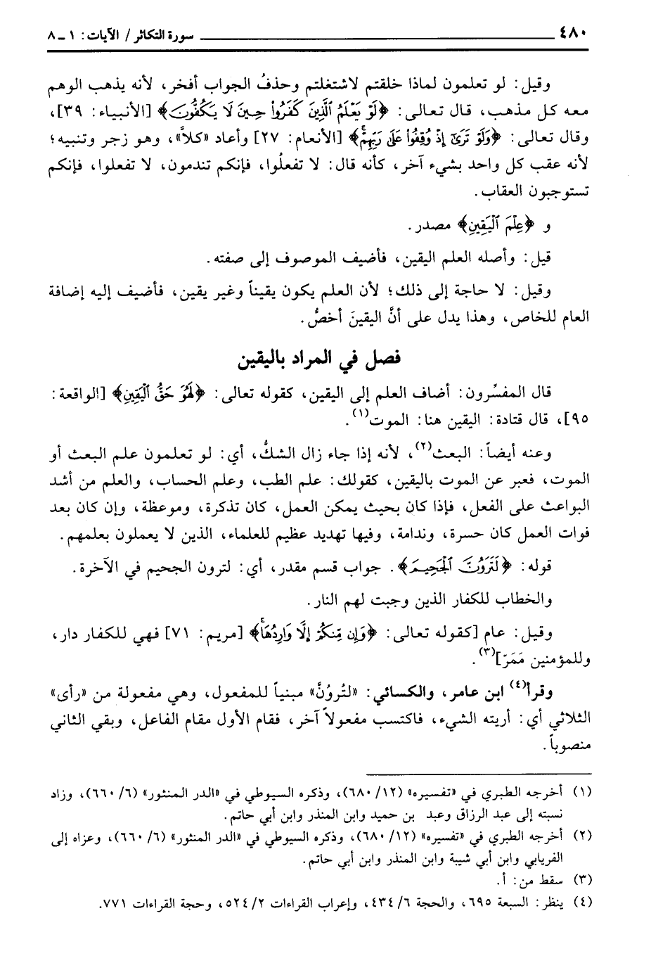 وعنه أيضاً: البعث، لأنه إذا جاء زال الشكُّ، أي: لو تعلمون علم البعث أو الموت، فعبر عن الموت باليقين، كقولك: علم الطب، وعلم الحساب، والعلم من أشد البواعث على الفعل، فإذا كان بحيث يمكن العمل، كان تذكرة، وموعظة، وإن كان بعد فوات العمل كان حسرة، وندامة، وفيها تهديد عظيم للعلماء، الذين لا يعملون بعلمهم.
