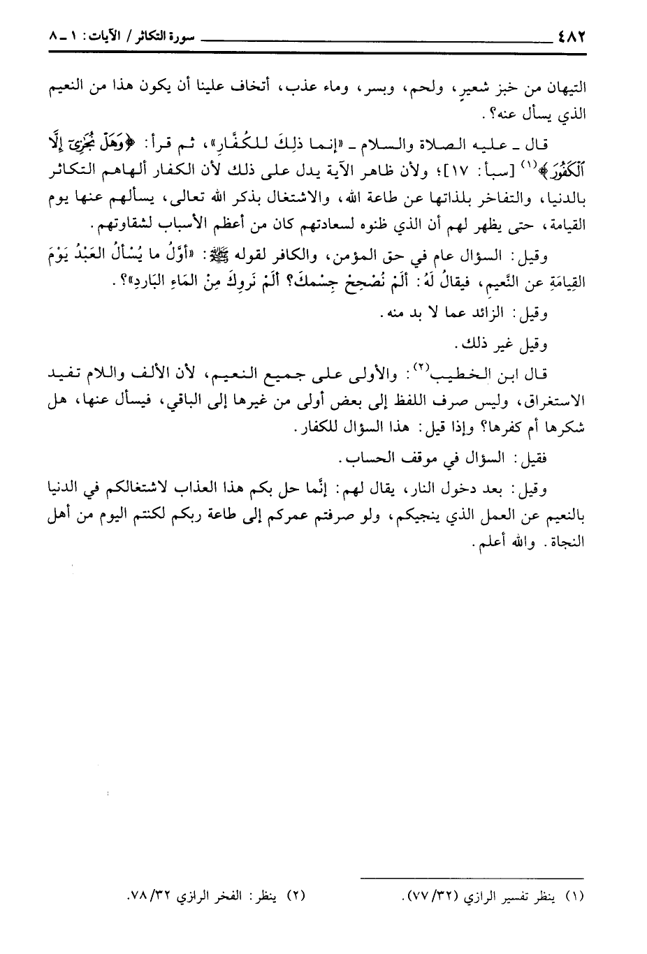 قال - عَلَيْهِ الصَّلَاة وَالسَّلَام ُ -» إنما ذلِكَ للكُفَّارِ «ثم قرأ: {وَهَلْ نجازي إِلاَّ الكفور} [سبأ: 17] ؛ ولأن ظاهر الآية يدل على ذلك لأن الكفار ألهاهم التكاثر بالدنيا، والتفاخر بلذاتها عن طاعة الله، والاشتغال بذكر الله تعالى، يسألهم عنها يوم القيامة، حتى يظهر لهم أن الذي ظنوه لسعادتهم كان من أعظم الأسباب لشقاوتهم.