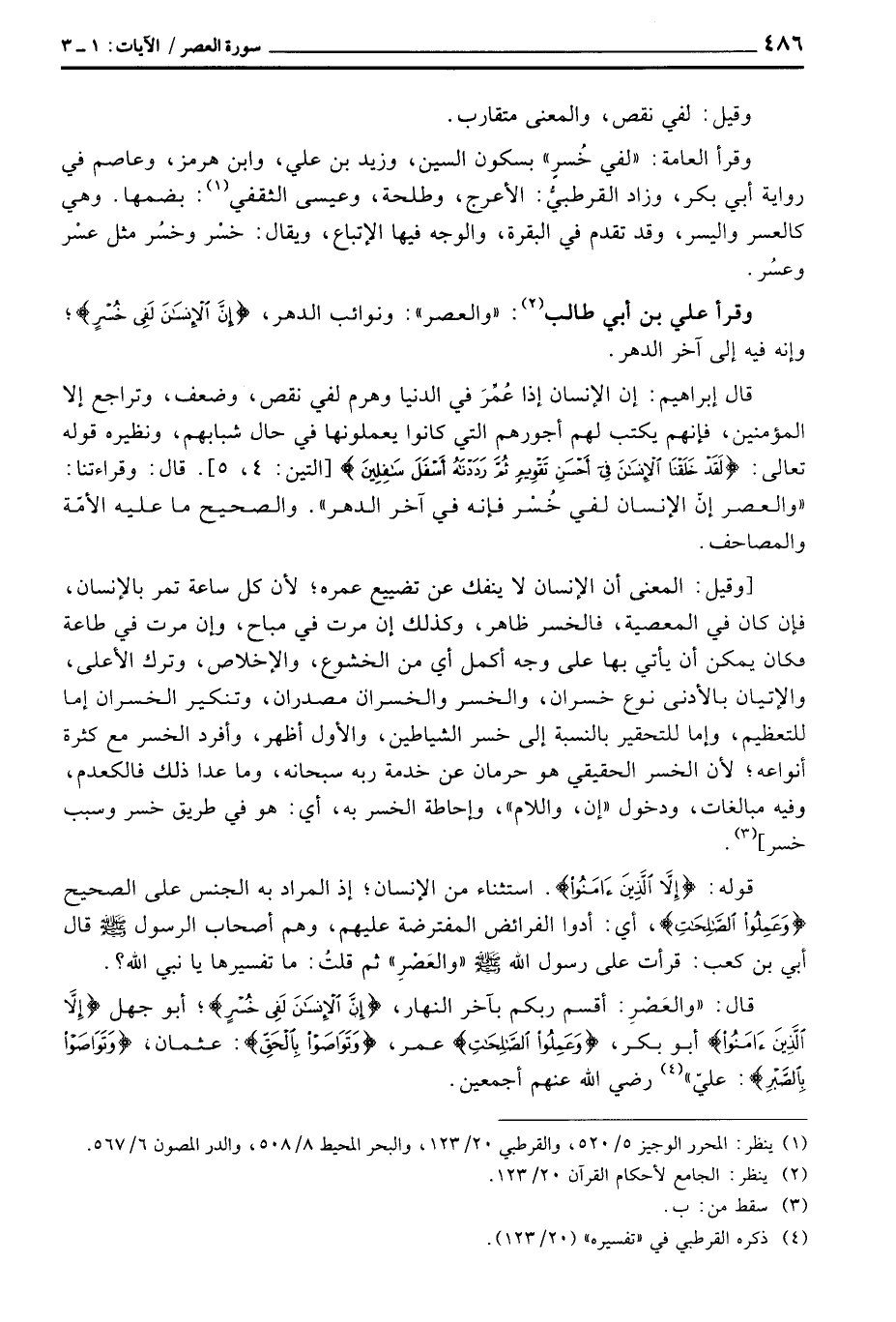 قال إبراهيم: إن الإنسان إذا عُمِّرَ في الدنيا وهرم لفي نقص، وضعف، وتراجع إلا المؤمنين، فإنهم يكتب لهم أجورهم التي كانوا يعملونها في حال شبابهم، ونظيره قوله تعالى: {لَقَدْ خَلَقْنَا الإنسان في أَحْسَنِ تَقْوِيمٍ ثُمَّ رَدَدْنَاهُ أَسْفَلَ سَافِلِينَ} [التين: 4، 5] . قال: وقراءتنا: «والعصر إنّ الإنسان لفي خُسْر فإنه في آخر الدهر» . والصحيح ما عليه الأمّة والمصاحف.