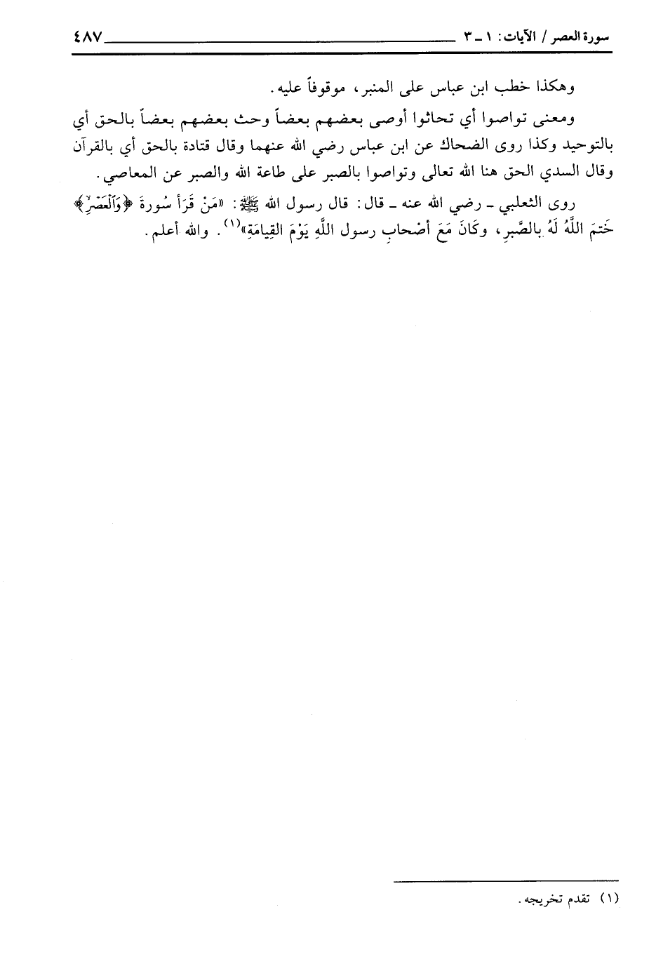 روى الثعلبي - رَضِيَ اللَّهُ عَنْه - قال: قال رسول الله صَلَّى اللَّهُ عَلَيْهِ وَسَلَّم َ: «مَنْ قَرَأ سُورةَ {والعصر} خَتمَ اللهُ لَهُ بالصَّبْرِ، وكَانَ مَعَ أصْحابِ رسول اللهِ يَوْمَ القِيَامَةٍ» والله أعلم.