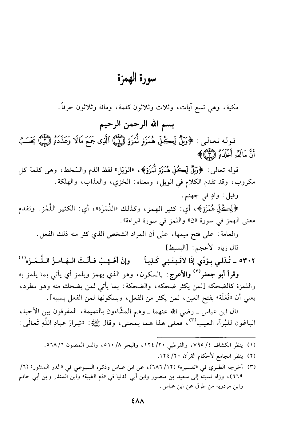 مكية، وهي تسع آيات، وثلاث وثلاثون كلمة، ومائة وثلاثون حرفا. بسم الله الرحمن الرحيم قوله: {ويْلٌ لِّكُلِّ هُمَزَةٍ لُّمَزَة} ، «الوَيْل» لفظ الذم والسّخط، وهي كلمة كل مكروب، وقد تقدم الكلام في الويل، ومعناه: الخزي، والعذاب، والهلكة.
