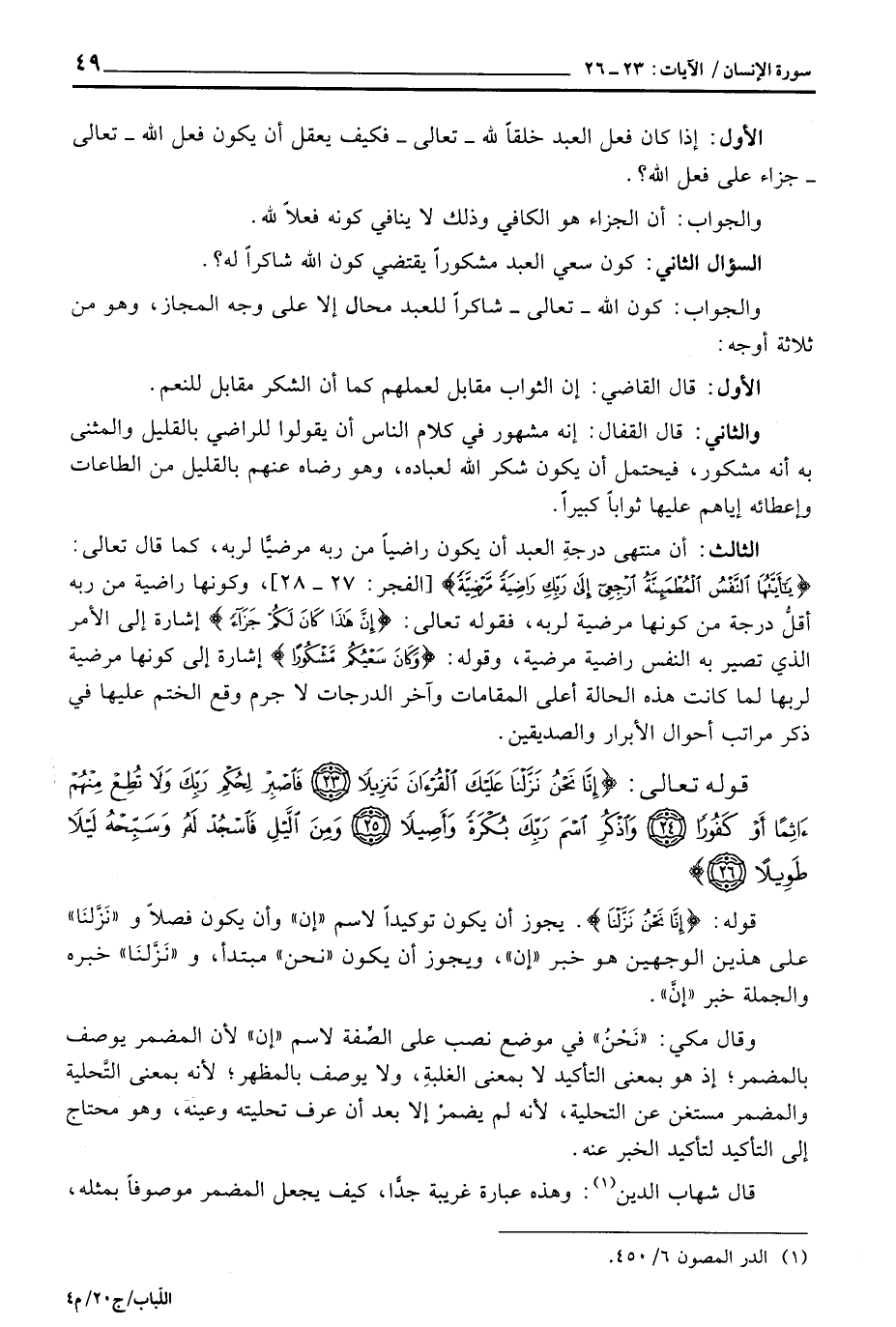 الثالث: أن منتهى درجة العبد راضياً من ربه مرضيًّا لربه، كما قال تعالى: {ياأيتها النفس المطمئنة ارجعي إلى رَبِّكِ رَاضِيَةً مَّرْضِيَّةً} [الفجر: 27 - 28] ، وكونها راضية من ربه أقلُّ درجة من كونها مرضية لربه، فقوله تعالى: {إِنَّ هذا كَانَ لَكُمْ جَزَآءً} إشارة إلى الأمر الذي تصير به النفس راضية مرضية، وقوله: {وَكَانَ سَعْيُكُم مَّشْكُوراً} إشارة إلى كونها مرضية لربها لما كانت الحالة أعلى المقامات وآخر الدرجات لا جرم وقع الختم عليها في ذكر مراتب أحوال الأبرار والصديقين.