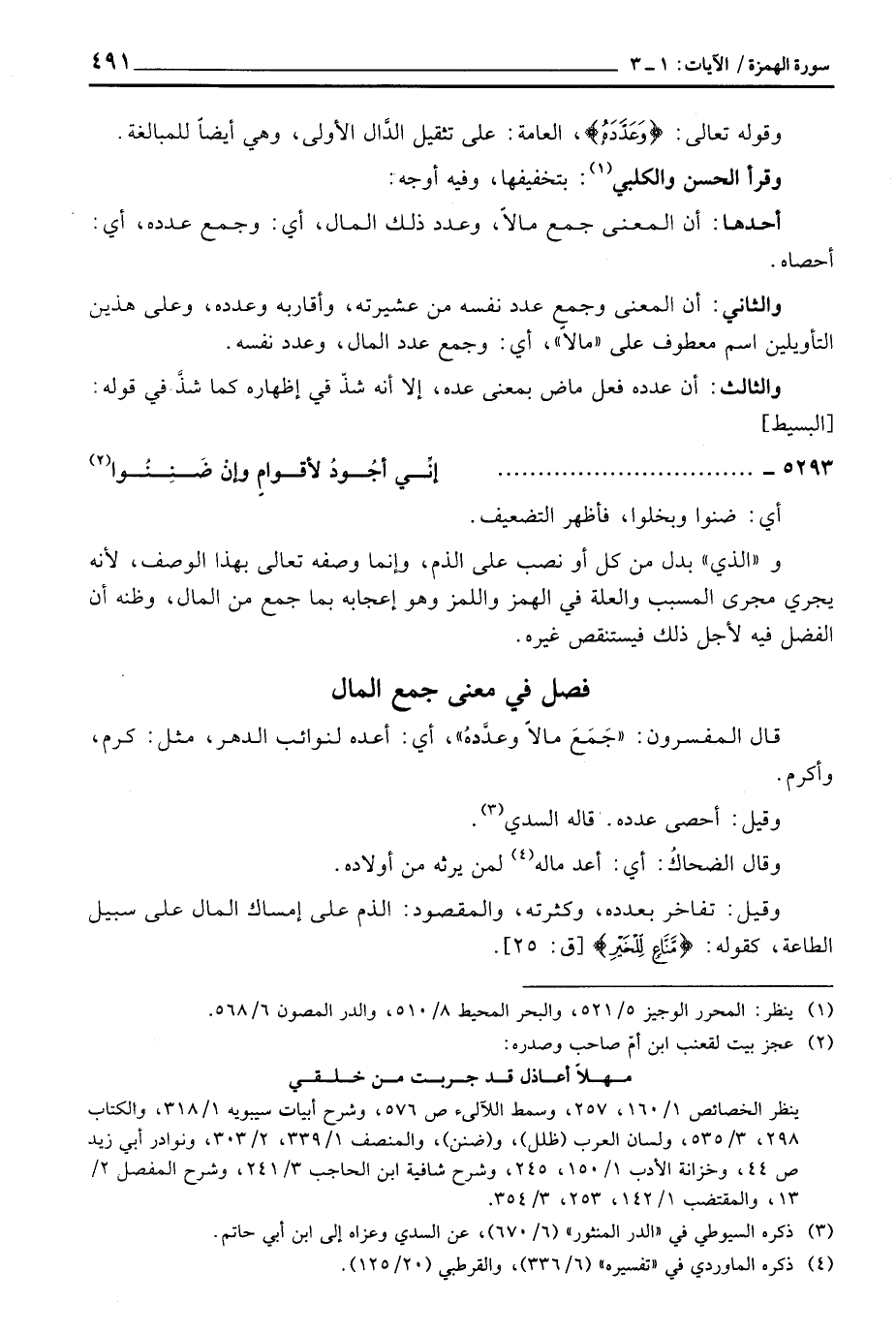 قال المفسرون: {جَمَعَ مالاً وعدَّدهُ} ، أي: أعده لنوائب الدهر، مثل: كرم، وأكرم.