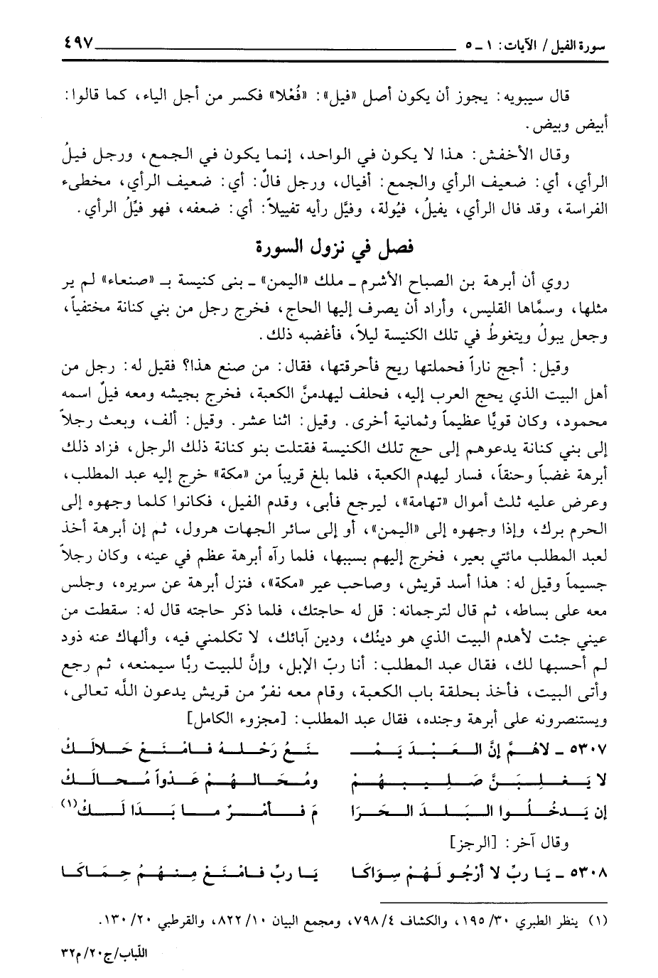 وقيل: أجج ناراً فحملتها ريح فاحرقتها، فقال: من صنع هذا؟ فقيل له: رجل من أهل البيت الذي يحج العرب إليه، فحلف ليهدمنَّ الكعبة، فخرج بجيشه ومعه فيلٌ اسمه محمود، وكان قويًّا عظيماً وثمانية أخرى. وقيل: اثنا عشر. وقيل: ألف، وبعث رجلاً إلى بني كنانة يدعوهم إلى حج تلك الكنيسة فقتلت بنو كنانة ذلك الرجل، فزاد ذلك أبرهة غضباً وحنقاً، فسار ليهدم الكعبة، فلما بلغ قريباً من «مكة» خرج إليه عبد المطلب، وعرض عليه ثلث أموال «تهامة» ، ليرجع فأبى، وقدم الفيل، فكانوا كلما وجهوه إلى الحرم برك، وإذا وجهوه إلى «اليمن» ، أو إلى سائر الجهات هرول، ثم إن أبرهة أخذ لعبد المطلب مائتي بعير، فخرج إليهم بسببها، فلما رآه أبرهة عظم في عينه، وكان رجلاً جسيماً وقيل له: هذا أسد قريش، وصاحب عير «مكة» ، فنزل أبرهة عن سريره، وجلس معه على بساطه، ثم قال لترجمانه: قل له حاجتك، فلما ذكر حاجته قال له: سقطت من عيني جئت لأهدم البيت الذي هو دينُك، ودين آبائك، لا تكلمني فيه، وألهاك عنه ذود لم أحسبها لك، فقال عبد المطلب: أنا ربّ الإبل، وإنَّ للبيت ربًّا سيمنعه، ثم رجع وأتى البيت، فأخذ بحلقة باب الكعبة، وقام معه نفرٌ من قريش يدعون الله تعالى، ويستنصرونه على أبرهة وجنده، فقال عبد المطلب: [مجزوء الكامل]