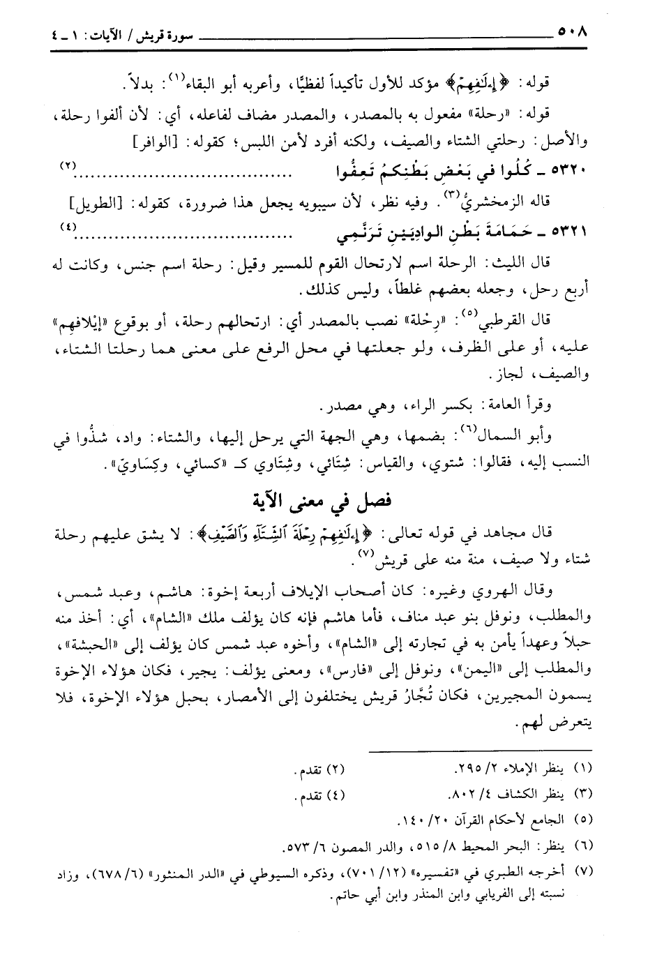 وقال الهروي وغيره: كان أصحاب الإيلاف أربعة إخوة: هاشم، وعبد شمس، والمطلب، ونوفل بنو عبد مناف، فأما هاشم فإنه كان يؤلف ملك «الشام» ، أي: أخذ منه حبلاً وعهداً يأمن به في تجارته إلى «الشام» ، وأخوه عبد شمس كان يؤلف إلى «الحبشة» ، والمطلب إلى «اليمن» ، ونوفل إلى «فارس» ، ومعنى يؤلف: يجير، فكان هؤلاء الإخوة يسمون المجيرين، فكان تُجَّارُ قريش يختلفون إلى الأمصار، بحبل هؤلاء الإخوة، فلا يتعرض لهم.