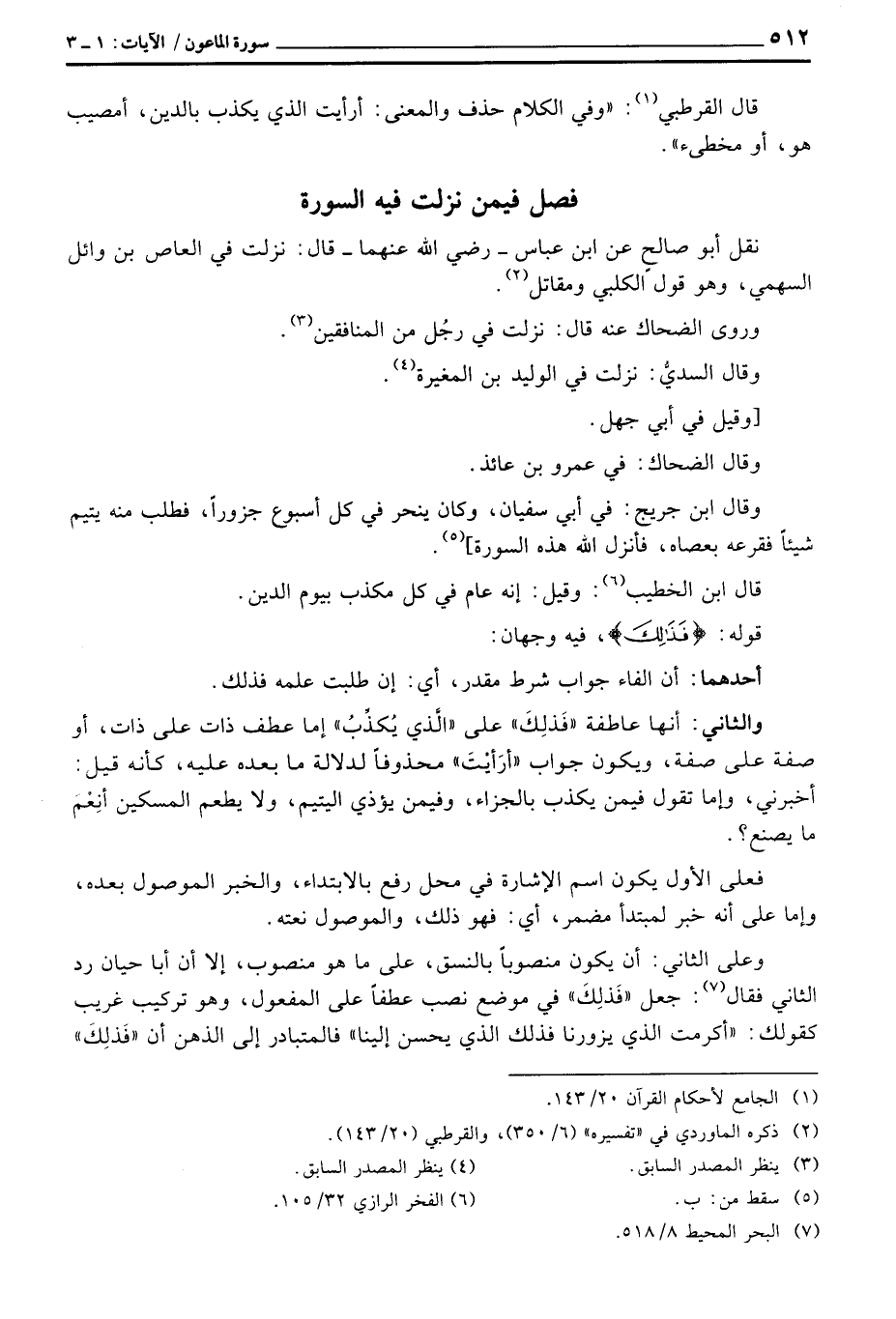 وقال ابن جريج: في أبي سفيان، وكان ينحر في كل أسبوع جزوراً، فطلب منه يتيم شيئاً فقرعه بعصاه، فأنزل الله هذه السورة] .