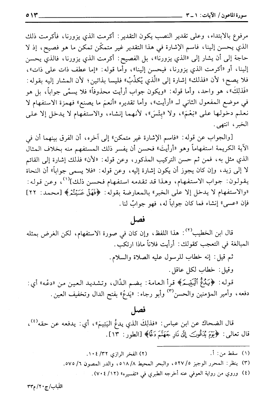 مرفوع بالابتداء، وعلى تقدير النصب يكون التقدير: أكرمت الذي يزورنا، فأكرمت ذلك الذي يحسن إلينا، فاسم الإشارة في هذا التقدير غير متمكِّن تمكن ما هو فصيح، إذ لا حاجة إلى أن يشار إلى «الذي يزورنا» ، بل الفصيح: أكرمت الذي يزورنا، فالذي يحسن إلينا، أو «أكرمت الذي يزورنا، فيحسن إلينا» ، وأما قوله: «إما عطف ذات على ذات» ، فلا يصح؛ لأن «فذلك» إشارة إلى «الَّذي يُكذِّبُ» فليسا بذاتين؛ لأن المشار إليه بقوله: «فَذلِكَ» هو واحد، وأما قوله: «ويكون جواب أرأيت محذوفاً» فلا يسمَّى جواباً، بل هو في موضع المفعول الثاني ل «أرأيت» ، وأما تقديره «أنعمَ ما يصنع» فهمزة الاستفهام لا نعلم دخولها على «نِعْمَ» ، ولا «بِئْسَ» ، لأنهما إنشاء، والاستفهام لا يدخل إلا علىلخبر، انتهى.