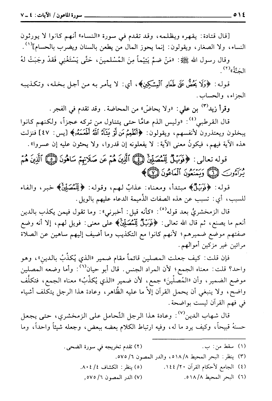 فإن قلت: كيف جعلت المصلين قائماً مقام الضمير {الذي يُكذِّبُ بالدينِ} ، وهو واحد؟ قلت: معناه الجمع؛ لأن المراد الجنس. قال أبو حيان: وأما وضعه المصلين موضع الضمير، وأن «المُصلِّينَ» جمع، لأن ضمير «الذي يُكذِّبُ» معناه الجمع، فتكلُّف واضح، ولا ينبغي أن يحمل القرآن إلاَّ ما عليه الظَّاهر، وعادة هذا الرجل يتكلف أشياء في فهم القرآن ليست بواضحة.
