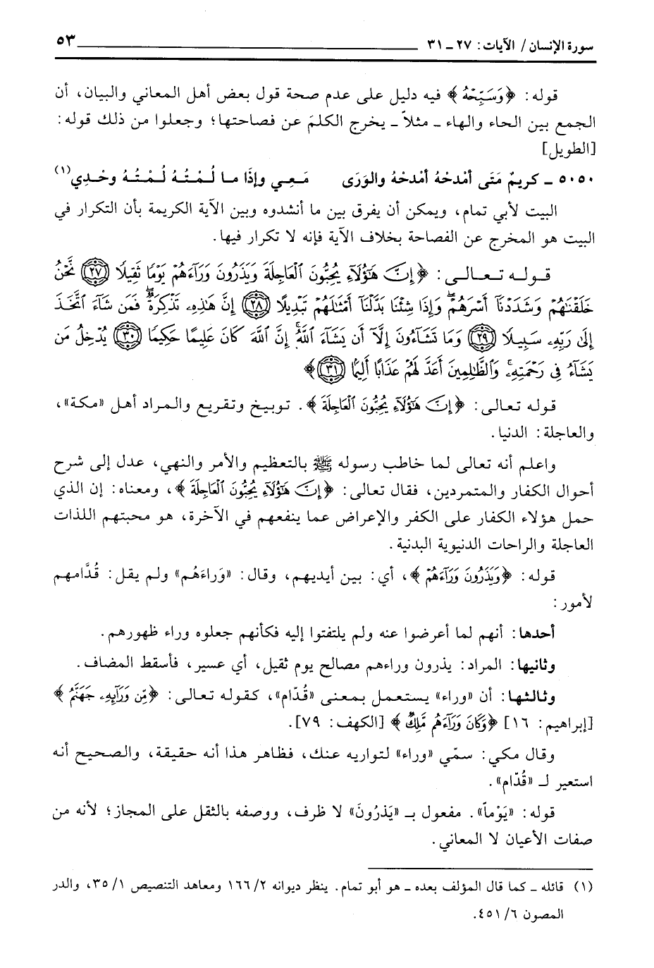 قوله: «يَوْماً» . مفعول ب «يَذَرُونَ» لا ظرف، وصفه بالثقل على المجاز؛ لأنه من صفات الأعيان لا المعاني.