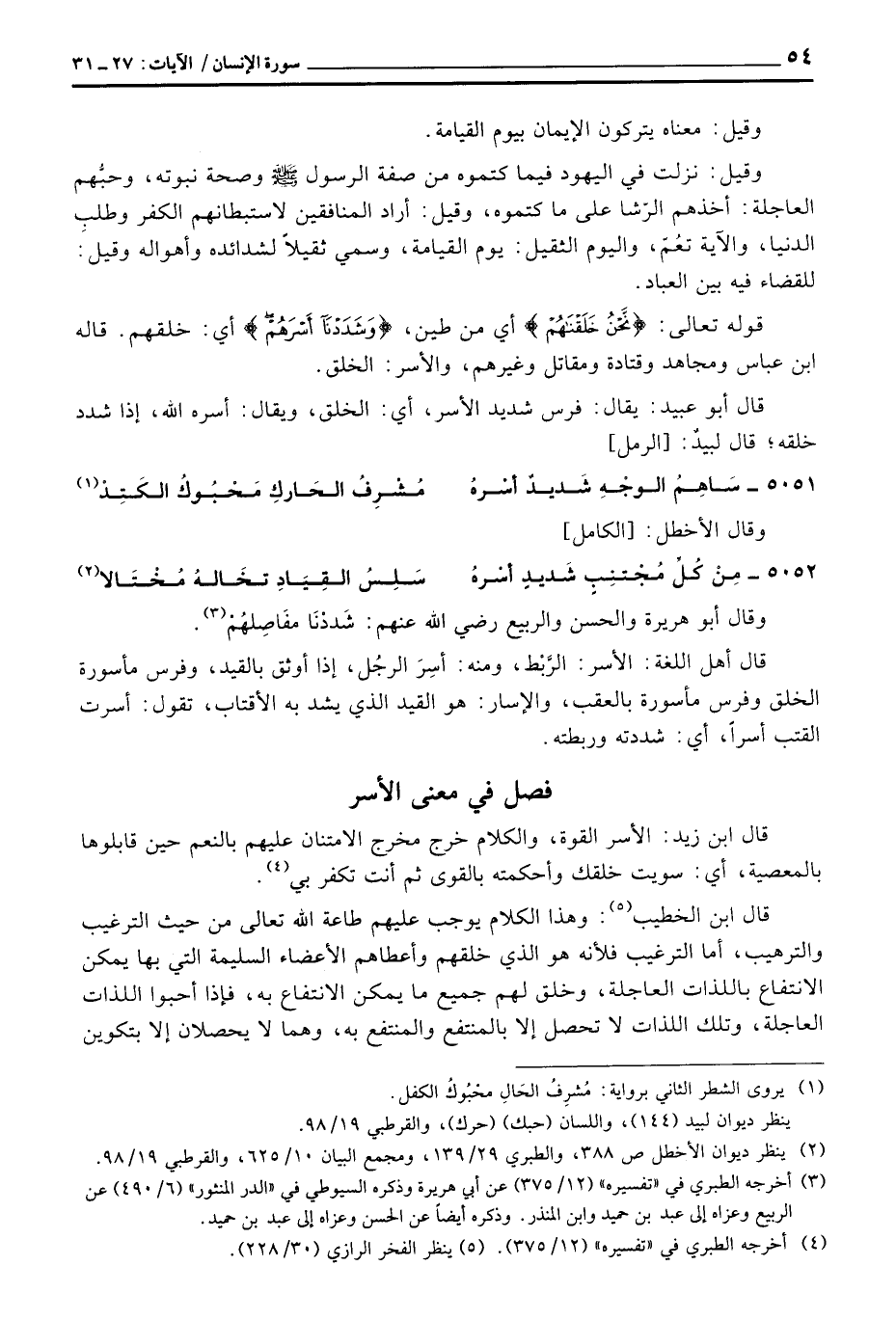 قوله تعالى: {نَّحْنُ خَلَقْنَاهُمْ} أي من طين، {وَشَدَدْنَآ أَسْرَهُمْ} أي: خلقهم. قاله ابن عباس ومجاهد وقتادة ومقاتل وغيرهم، والأسر: الخلق.