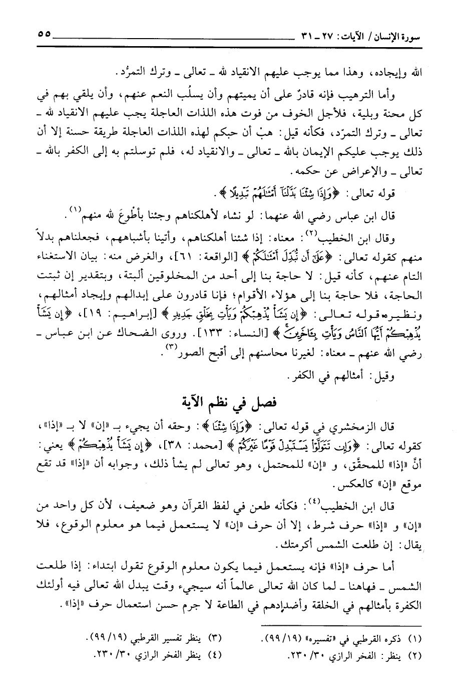 قال ابن الخطيب: فكأنه طعن في لفظ القرآن وهو ضعيف، لأن كل واحد من «إن» و «إذا» حرف شرط، إلا أن حرف «إن» لا يستعمل فيما هو معلوم الوقوع، فلا يقال: إن طلعت الشمس أكرمتك.