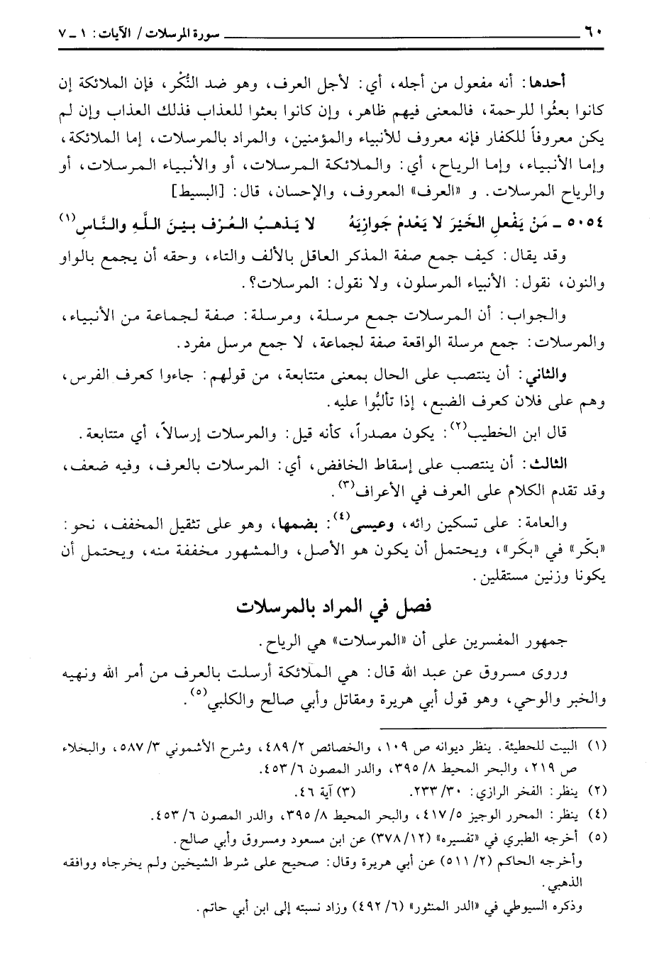 أحدها: أنه مفعول من أجله، أي: لأجل العرف، وهو ضد النُّكْر، فإن الملائكة إن كانوا بعثُوا للرحمة، فالمعنى فيه ظاهر، وإن كانوا بعثوا للعذاب فذلك العذاب وإن لم يكن معروفاً للكفار فإنه معروف للأنبياء والمؤمنين، والمراد بالمرسلات، إما الملائكة، وإما الأنبياء، وإما الرياح، أي: والملائكة المرسلات، أو والأنبياء المرسلات، أو والرياح المرسلات. و «العرف» المعروف، والإحسان، قال: [البسيط]