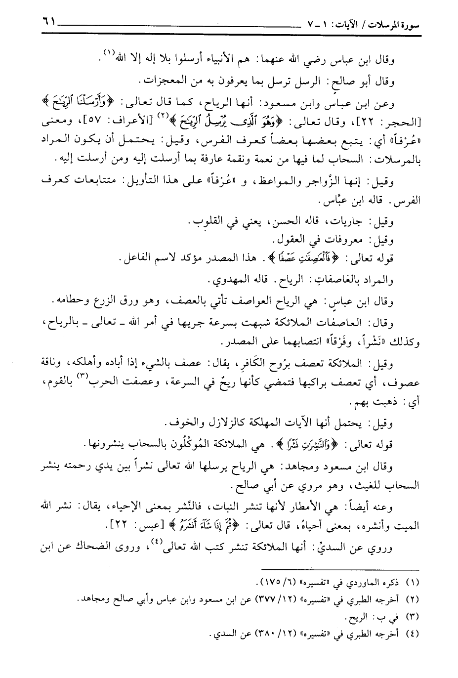 وعن ابن عباس وابن مسعود: أنها الرياح، كما قال تعالى: {وَأَرْسَلْنَا الرياح} [الحجر: 22] ، وقال تعالى: {وَهُوَ الذي يُرْسِلُ الرياح} [الأعراف: 57] ، ومعنى «عُرْفاً» أي: يتبع بعضها بعضاً كعرف الفرس، وقيل: يحتمل أن يكون المراد بالمرسلات: السحاب لما فيها من نعمة ونقمة عارفة بما أرسلت إليه ومن أرسلت إليه.