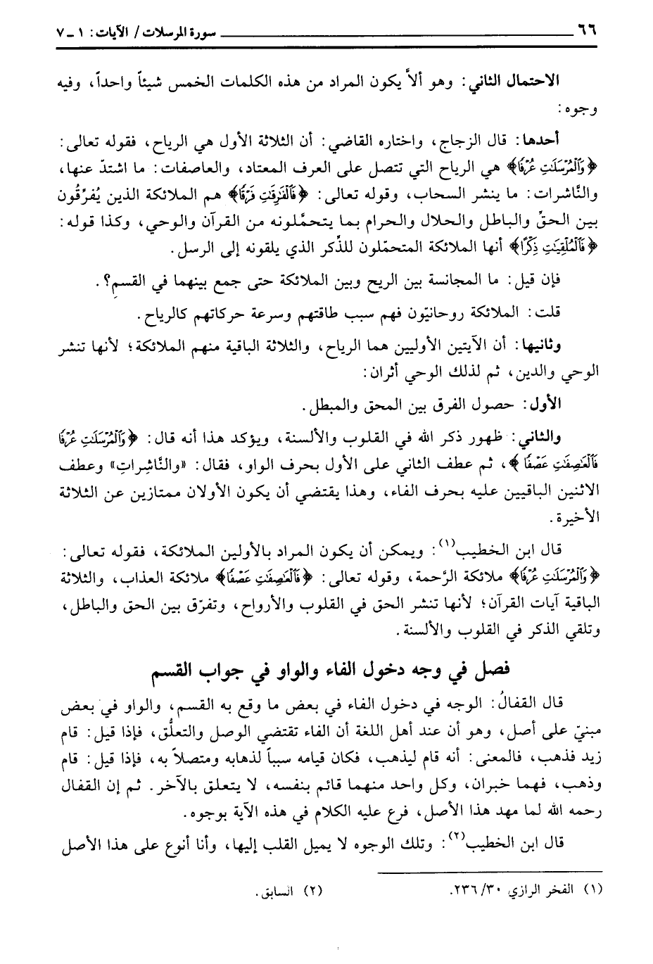 والثاني: ظهر الله في القلوب والألسنة، ويؤكد هذا أنه قال: {والمرسلات عُرْفاً فالعاصفات عَصْفاً} ، ثم عطف الثاني على الأول بحرف الواو، فقال: «والنَّاشِرَاتِ» وعطف الاثنين الباقيين عليه بحرف الفاء، وهذا يقتضي أن يكون الأولان ممتازين عن الثلاثة الأخيرة.