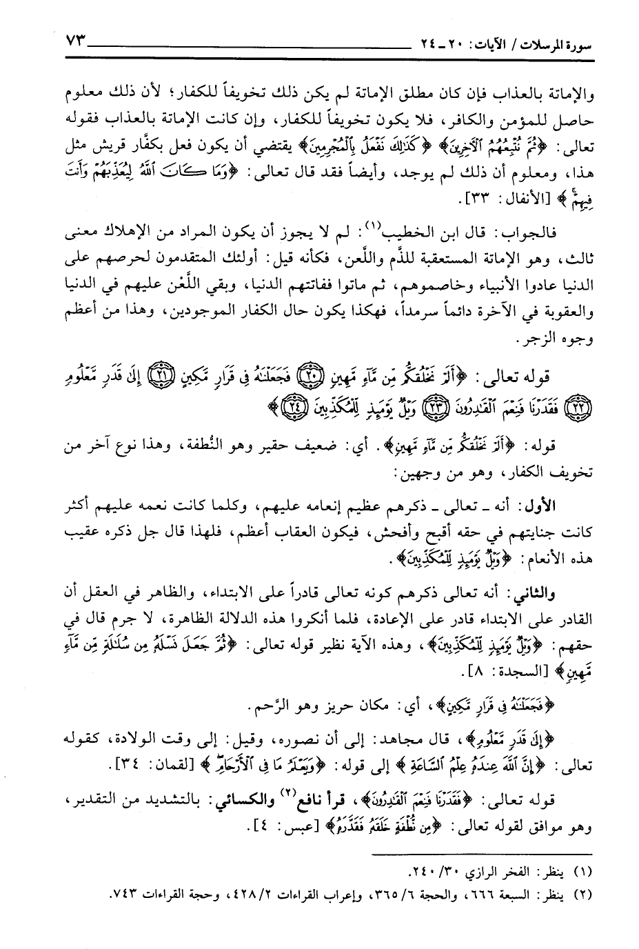 والإماتة بالعذاب فإن كان مطلق الإماتة لم يكن ذلك تخويفاً للكفار؛ لأن ذلك معلوم حاصل للمؤمن والكافر، فلا يكون تخويفاً للكفار، وإن كانت الإماتة بالعذاب فقوله تعالى: {ثُمَّ نُتْبِعُهُمُ الآخرين} {كَذَلِكَ نَفْعَلُ بالمجرمين} يقتضي أن يكون فعل بكفَّار قريش مثل هذا، ومعلوم أن ذلك لم يوجد، وأيضاً فقد قال تعالى: {وَمَا كَانَ الله لِيُعَذِّبَهُمْ وَأَنتَ فِيهِمْ} [الأنفال: 33] .