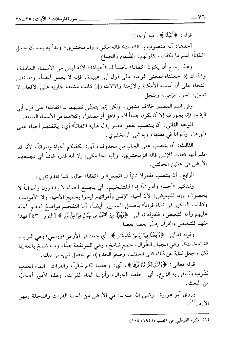 الوجه الثاني: أن ينتصب بفعل مقدر يدل عليه «كفاتاً» أي: يكفتهم أحياءً عى ظهرها، وأمواتاً في بطنها، وبه ثنى الزمخشري.