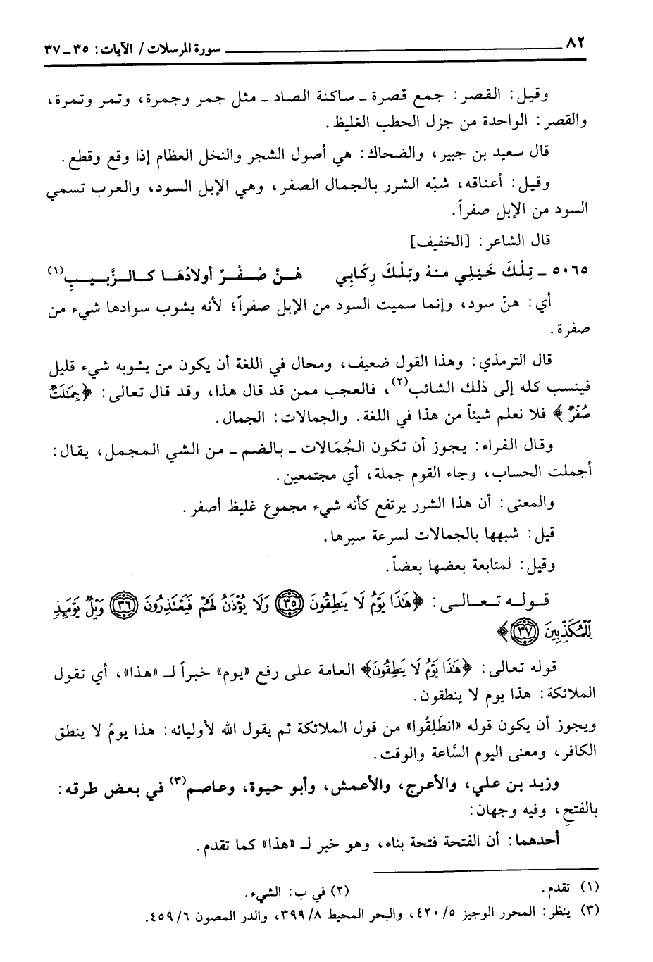 وقيل: أعناقه: شبّه الشرر بالجمال الصفر، وهي الإبل السود، والعرب تسمي السود من الإبل صفراً.