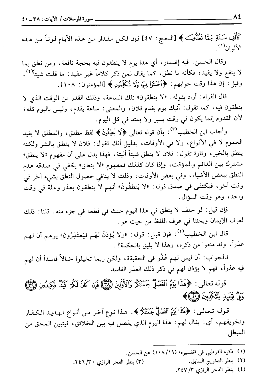 وأجاب ابن الخطيب: بأن قوله تعالى {لاَ يَنطِقُونَ} لفظ مطلق، والمطلق لا يفيد العموم لا في الأنواع، ولا في الأوقات، بدليل أنك تقول: فلان لا ينطق بالشر ولكنه ينطق بالخير، وتارة تقول: فلان لا ينطق شيئاً ألبتة، فهذا يدل على أن مفهوم «لا ينطق» مشترك بين الدائم والمؤقت، وإذا كان كذلك فمفهوم «لا ينطق» يكفي في صدقه عدم النطق ببعض الأشياء، وفي بعض الأوقات، وذلك لا ينافي حصول النطق بشيء آخر في وقت آخر، فيكتفى في صدق قوله: «لا يَنطقُونَ» أنهم لا ينطقون بعذر وعلة في وقت واحد، وهو وقت السؤال.