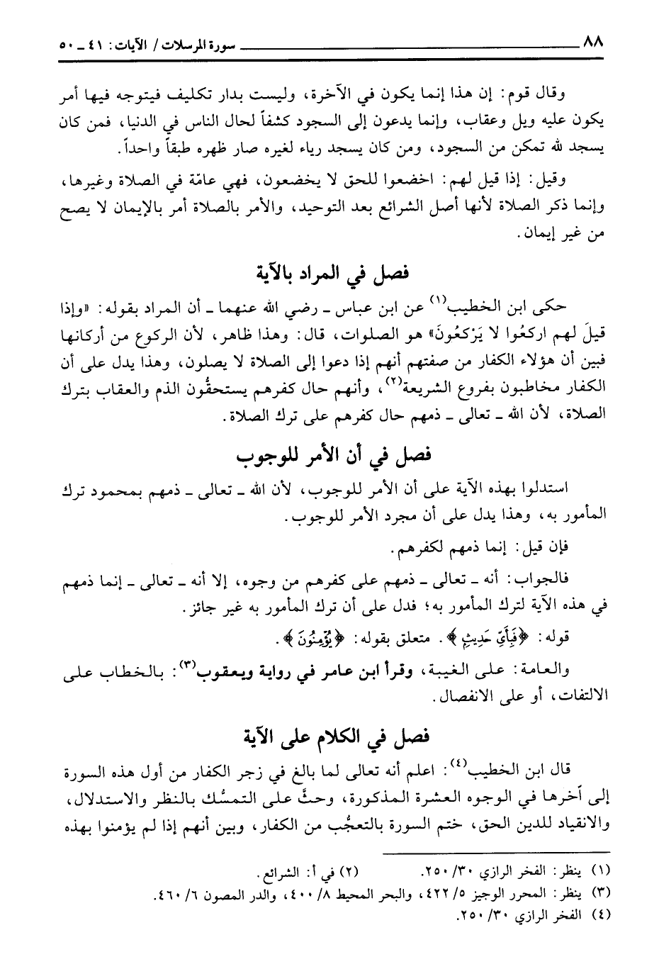 حكى ابن الخطيب عن ابن عباس - رَضِيَ اللَّهُ عَنْهما - أن المراد بقوله: {وإذا قيلَ لهم اركعُوا لا يَرْكعُونَ} هو الصلوات، قال: وهذا ظاهر، لأن الركوع من أركانها فبين أن هؤلاء الكفار من صفتهم أنهم إذا دعوا إلى الصلاة لا يصلون، وهذا يدل على أن الكفار مخاطبون بفروع الشريعة، وأنهم حال كفرهم يستحقُّون الذم والعقاب بترك الصلاة، لأن الله - تعالى - ذمهم حال كفرهم على ترك الصلاة.