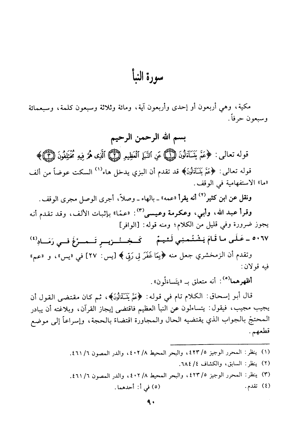 مكية، وهي أربعون أو إحدى وأربعون آية، ومائة وثلاثة وسبعون كلمة، وسبعمائة وسبعون حرفا. قوله تعالى: {عَمَّ يَتَسَآءَلُونَ} قد تقدم أن البزي يدخل هاء السكت عوضاً من ألف «ما» الاستفهامية في الوقف.