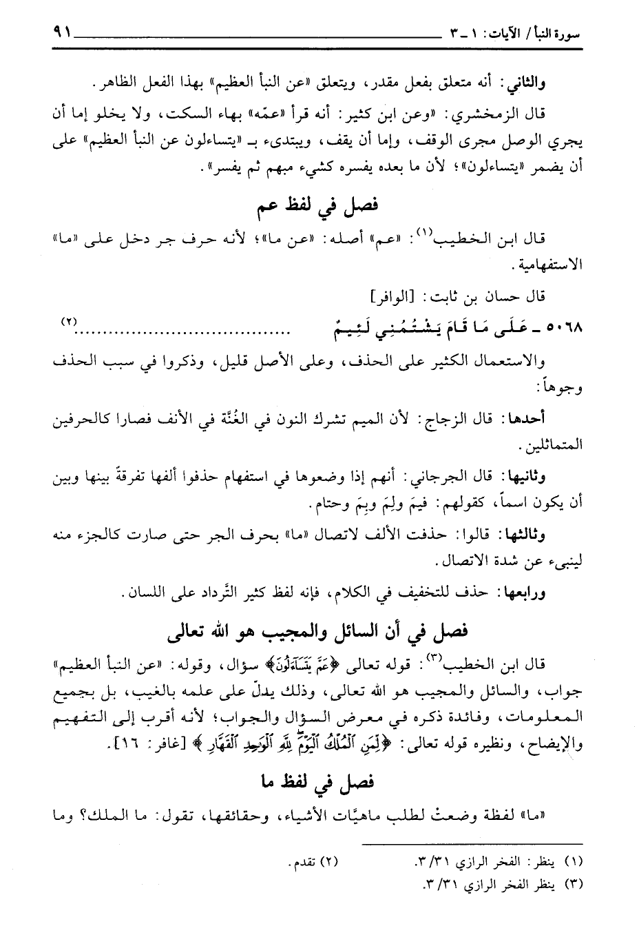 قال ابن الخطيب: قوله تعالى {عَمَّ يَتَسَآءَلُونَ} سؤال، وقوله: «عن النبأ العظيم» جواب، والسائل والمجيب هو الله تعالى، وذلك يدلّ على علمه بالغيب، بل بجميع المعلومات، وفائدة ذكره في معرض السؤال والجواب؛ لأنه أقرب إلى التفهيم والإيضاح، ونظيره قوله تعالى: {لِّمَنِ الملك اليوم لِلَّهِ الواحد القهار} [غافر: 16] .