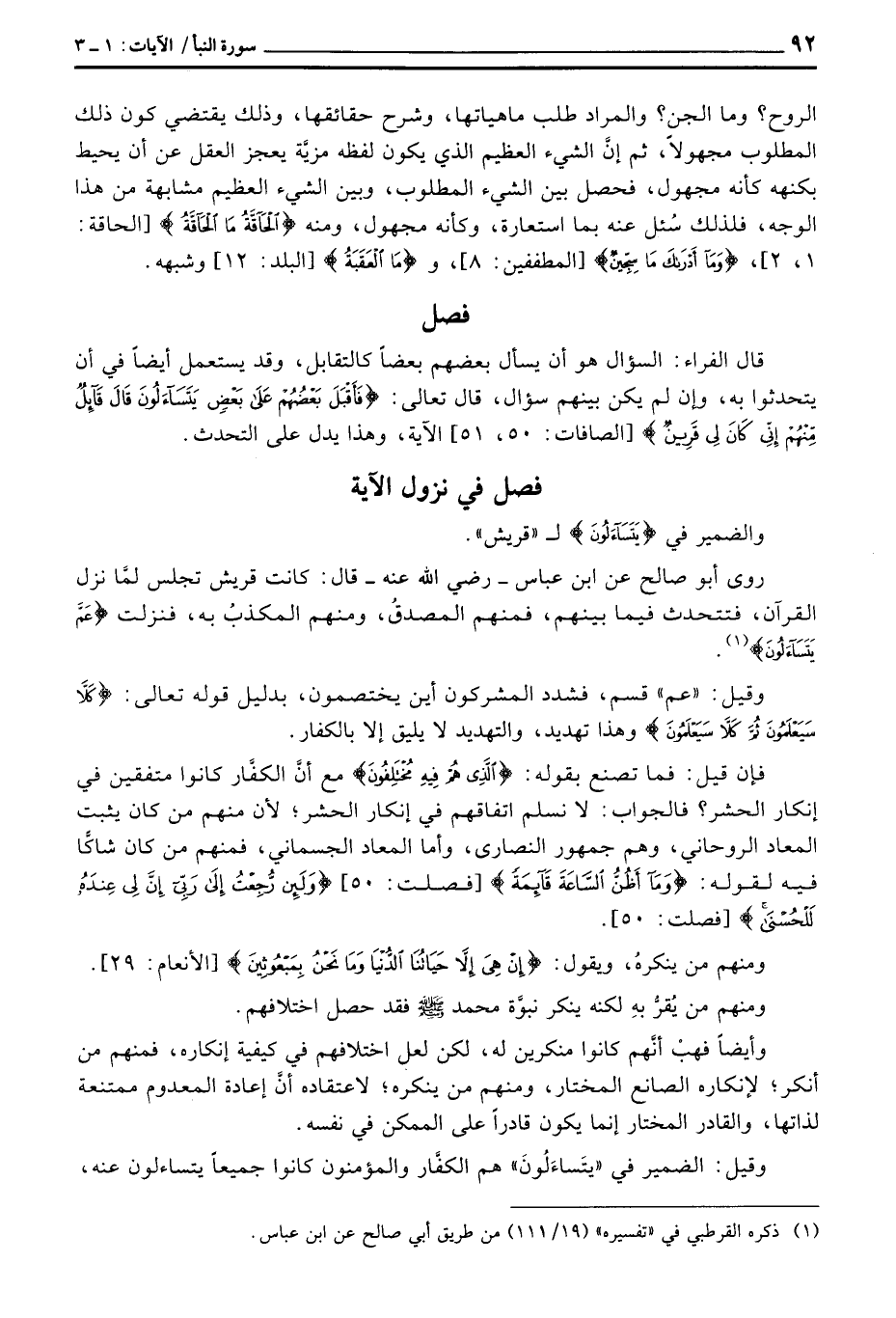 روى أبو صالح عن ابن عباس - رَضِيَ اللَّهُ عَنْه - قال: كانت قريش تجلس لمَّا نزل القرآن، فتتحدث فيما بينهم، فمنهم المصدقُ، ومنهم المكذبُ به، فنزلت {عَمَّ يَتَسَآءَلُونَ} .