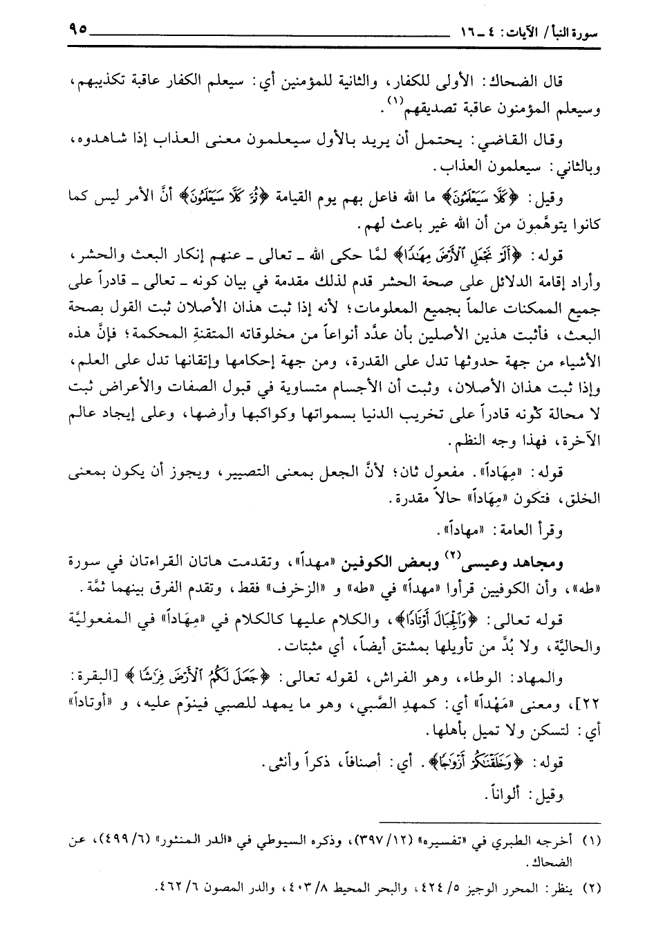 والمهاد: الوطاء، وهو الفراش، لقوله تعالى: {جَعَلَ لَكُمُ الأرض فِرَاشاً} [البقرة: 22] ، ومعنى «مَهْداً» أي: كمهدِ الصَّبي، وهو ما يمهد للصبي فينوّم عليه، و «أوتاداً» أي: لتسكن ولا تميل بأهلها.