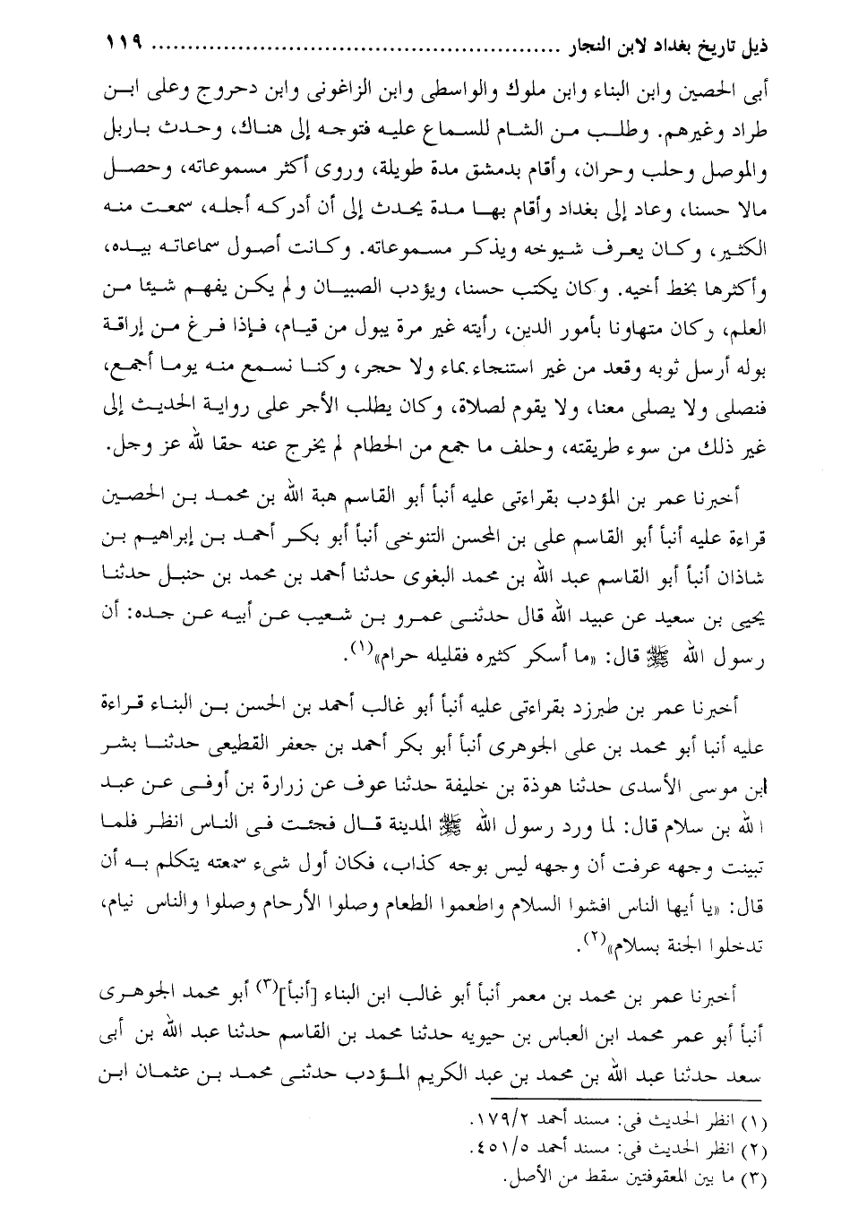 أخبرنا عمر بن المؤدب بِقِرَاءَتِي عَلَيْهِ أَنْبَأَ أَبُو الْقَاسِمِ هِبَةُ اللَّهِ بن محمد بن الحصين قِرَاءَةً عَلَيْهِ أَنْبَأَ أَبُو الْقَاسِمِ عَلِيُّ بْنُ المحسن التنوخي أَنْبَأَ أَبُو بَكْرٍ أَحْمَد بْن إِبْرَاهِيم بْن شاذان أنبأ أَبُو الْقَاسِم عَبْد اللَّهِ بْن مُحَمَّد الْبَغَوِيُّ حَدَّثَنَا أحمد بن محمد بن حنبل حَدَّثَنَا يَحْيَى بْنُ سَعِيدٍ عَنْ عُبَيْدِ اللَّهِ قَالَ حَدَّثَنِي عَمْرُو بْنُ شُعَيْبٍ عَنْ أَبِيهِ عَنْ جَدِّهِ: أَنَّ رَسُولَ اللَّهِ صَلَّى اللَّهُ عَلَيْهِ وَسَلَّمَ قال: «ما أسكر كثيره فقليله حرام» [1] .