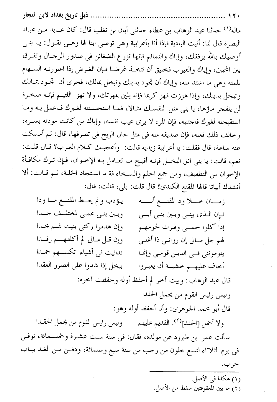 ماله [1] حدثنا عبد الوهاب بن عطاء حدثني أبان بن تغلب قال: كان عابد من عباد البصرة قال لنا: أتيت البادية فإذا أنا بأعرابية وهي توصي ابنا لها وهي تقول: يا بنى أوصيك بالله يوفقك، وإياك والنمائم فإنها تزرع الضغائن في صدور الرجال وتفرق بين المحبين، وإياك والعيوب فخليق أن تتخذ غرضا فإن الغرض إذا اعتورته السهام ثلمته وهي ما اشتد منه، وإياك أن تجود بدينك وتبخل بمالك، فحرى أن تجود بمالك وتبخل بدينك، وإذا هززت فهز كريما فإنه يلين بمهرتك، ولا تهز اللئيم فإنه صخرة لن يتفجر ماؤها، يا بنى مثل لنفسك مثالا، فما استحسنته لغيرك فاعمل به وما استقبحته لغيرك فاجتنبه، فإن المرء لا يرى عيب نفسه، وإياك من كانت مودته بسره، وخالف ذلك فعله، فإن صديقه منه في مثل حال الريح في تصرفها، قال: ثم أمسكت عنه ساعة، قال فقلت: يا أعرابية زيديه قالت: وأعجبك كلام العرب؟ قال قلت: