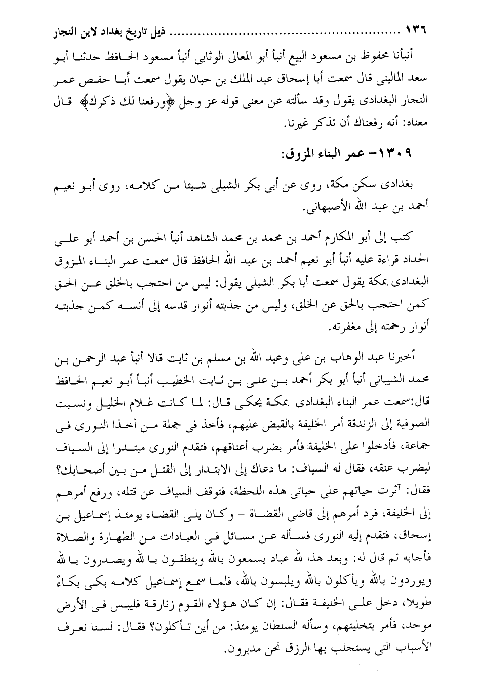 أخبرنا عبد الوهاب بْنِ عَلِيٍّ وَعَبْدُ اللَّهِ بْنُ مُسْلِمِ بْنِ ثابت قالا أنبأ عبد الرحمن بن محمد الشيباني أنبأ أبو بكر أحمد بن علي بن ثابت الخطيب أنبأ أبو نعيم الحافظ قَالَ: سمعت عُمَر البناء البغدادي بمكة يحكي قال: لما كانت غلام الخليل ونسبت الصوفِية إِلَى الزندقة أمر الخليفة بالقبض عليهم، فأخذ فِي جملة من أخذا النوري فِي جماعة، فأدخلوا عَلِيّ الخليفة فأمر بضرب أعناقهم، فتقدم النوري مبتدرا إِلَى السياف ليضرب عنقه، فَقَالَ له السياف: ما دعاك إِلَى الابتدار إِلَى القتل من بين أصحابك؟