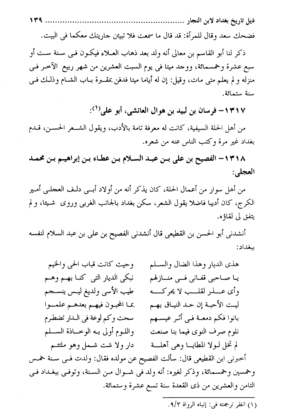أنشدنى أبو الحسن بن القطيعي قال أنشدنى الفصيح بن على بن عبد السلام لنفسه ببغداد: