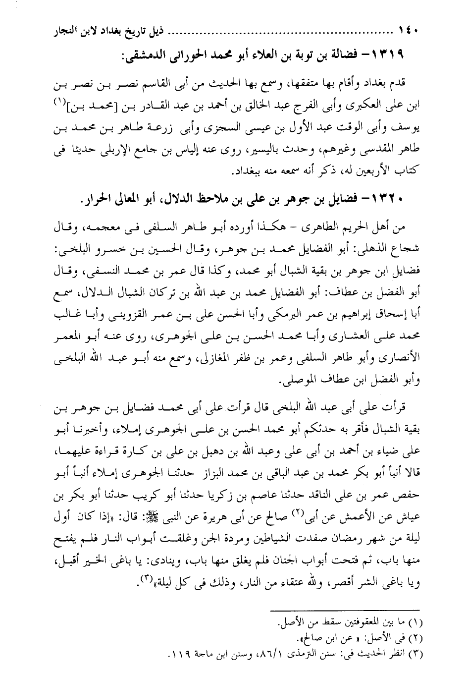 قرأت على أبى عبد الله البلخي قال قرأت على أبى محمد فضائل بن جوهر بن بقية الشبال فأقر به حدثكم أبو محمد الحسن بن على الجوهري إملاء، وأخبرنا أبو علي ضياء بن أحمد بن أبي على وعبد الله بن دهبل بن على بن كارة قراءة عليهما، قَالا أَنْبَأَ أَبُو بَكْرٍ مُحَمَّدُ بْنُ عَبْدِ الباقي بن محمد البزاز حدثنا الجوهري إملاء أنبأ أبو حفص عمر بن على الناقد حدثنا عاصم بن زكريا حدثنا أبو كريب حَدَّثَنَا أَبُو بَكْرِ بْنُ عَيَّاشٍ عَنِ الأَعْمَشِ عَنْ أَبِي [2] صَالِحٍ عَنْ أَبِي هُرَيْرَةَ عَنِ النَّبِيِّ صَلَّى اللَّهُ عَلَيْهِ وَسَلَّمَ: قَالَ: «إِذَا كان أول ليلة من شهر رمضان صفدت الشياطين ومردة الجن وغلقت أبواب النار فلم يفتح منها باب، ثم فتحت أبواب الجنان فلم يغلق منها باب، وينادى: يا باغي الخير أقبل، ويا باغي الشر أقصر، ولله عتقاء من النار، وذلك في كل ليلة» [3] .