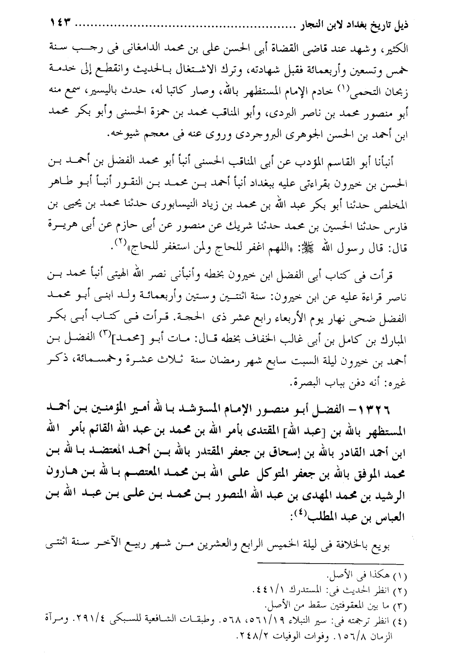 1326- الفضل أبو منصور الإمام المسترشد بالله أمير المؤمنين بن أحمد المستظهر بالله بن [عَبْد اللَّه] المقتدي بأمر اللَّه بْن مُحَمَّد بْن عَبْد اللَّه القائم بأمر الله ابن أَحْمَد القادر باللَّه بْن إِسْحَاق بْن جَعْفَر المقتدر باللَّه بْن أَحْمَد المعتضد باللَّه بن محمد الموفق بالله بْن جَعْفَر المتوكل عَلَى اللَّه